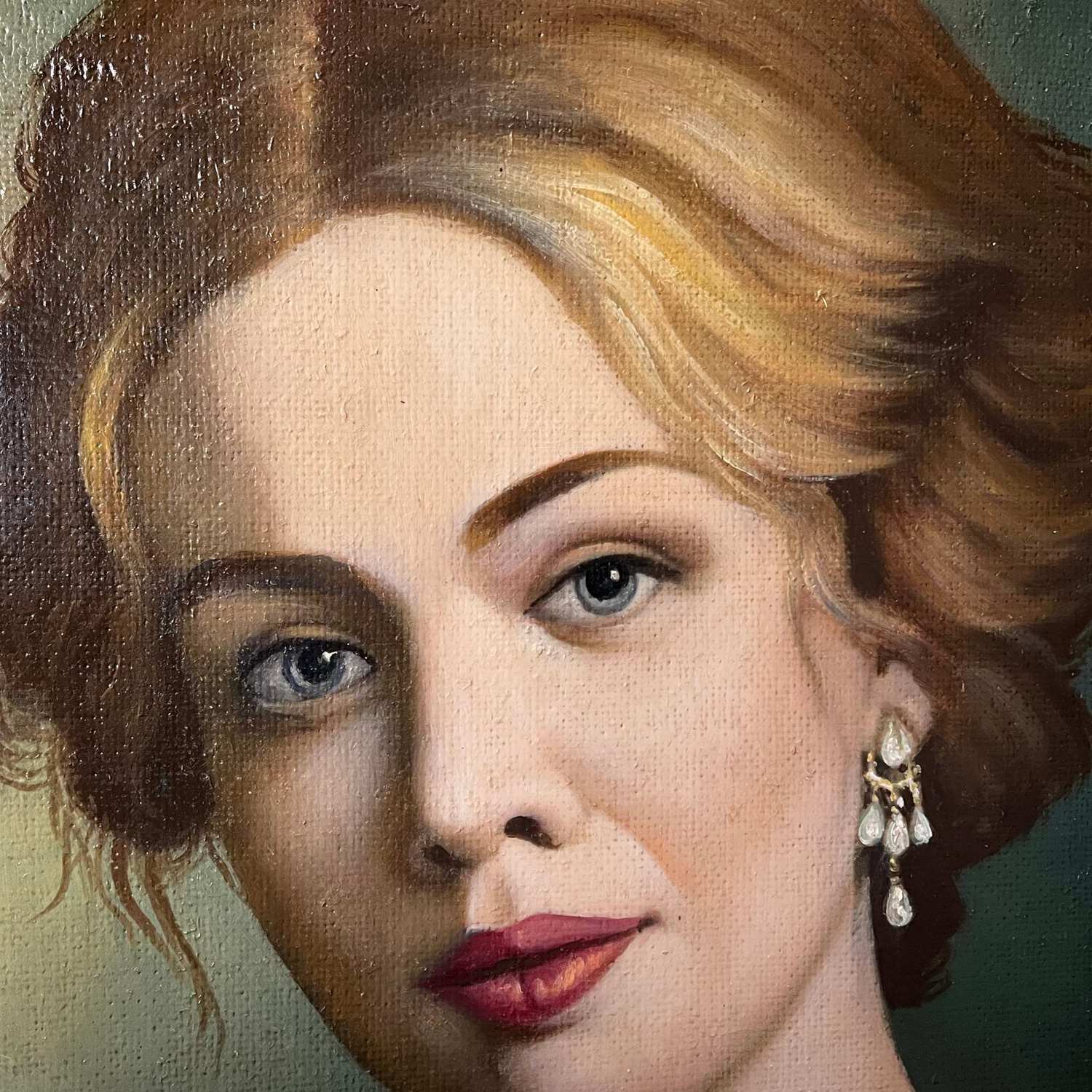 Dipinto Olio su tela raffigurante Ritratto di donna con collana e orecchini di perle, in abito rosso, periodo 1985.