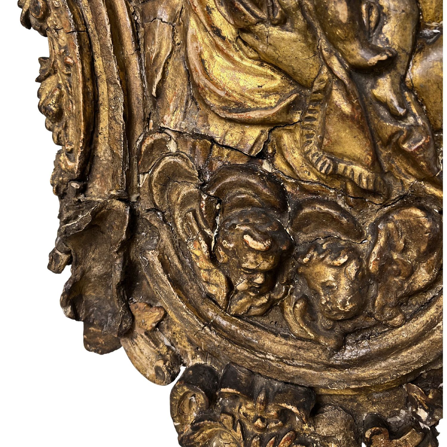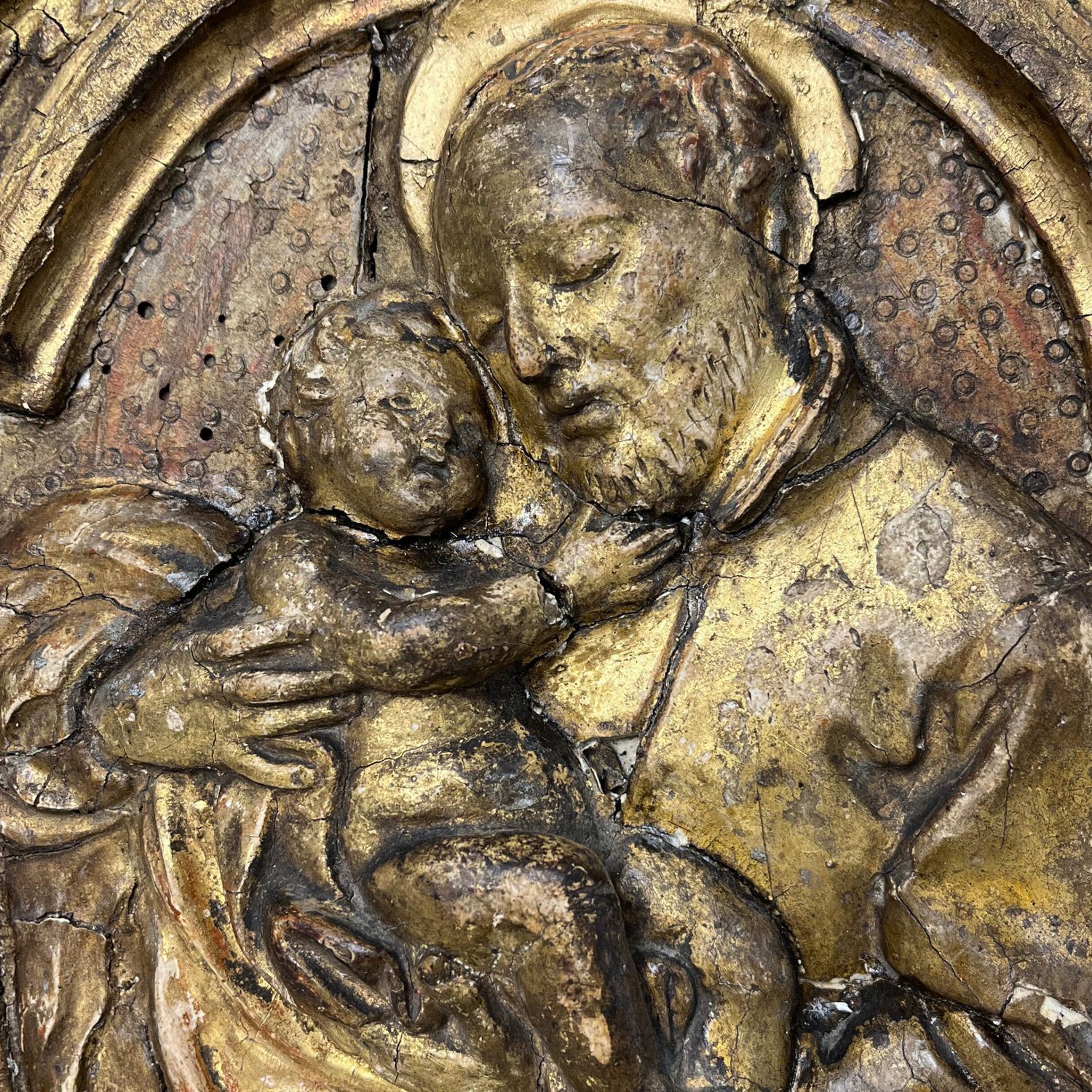 Scultura in legno dorato e Santo in scagliola, raffigurante San Giuseppe con bambino e puttini. Periodo XVIII secolo.
