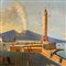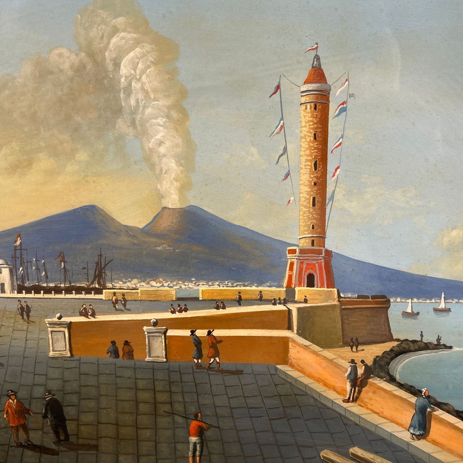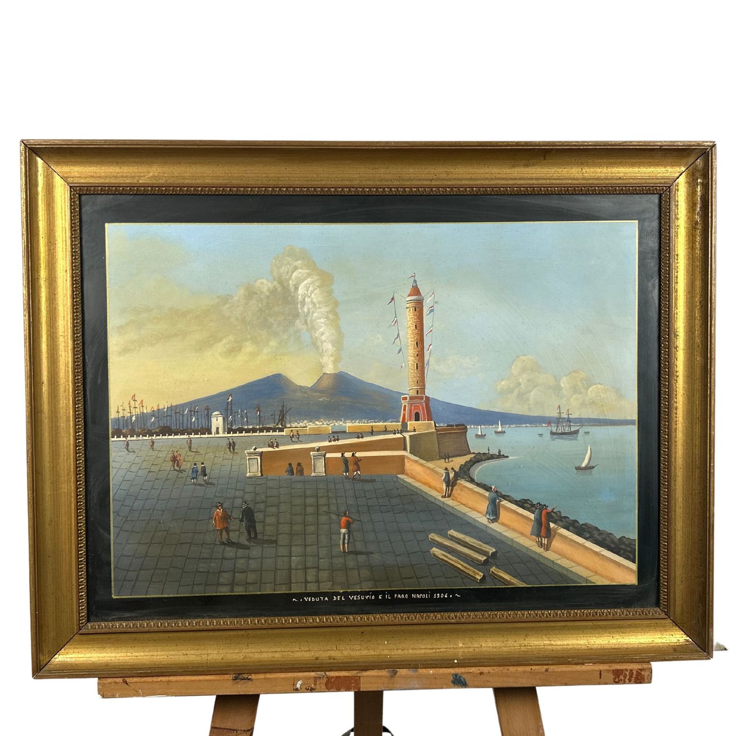 Dipinto Guazzo (tempera su carta) periodo XX secolo scuola Italiana raffigurante Veduta del Vesuvio e il Faro a Napoli nel 1906.