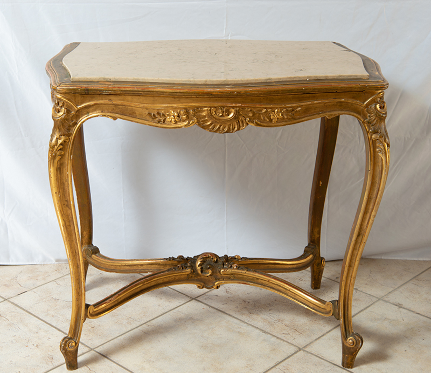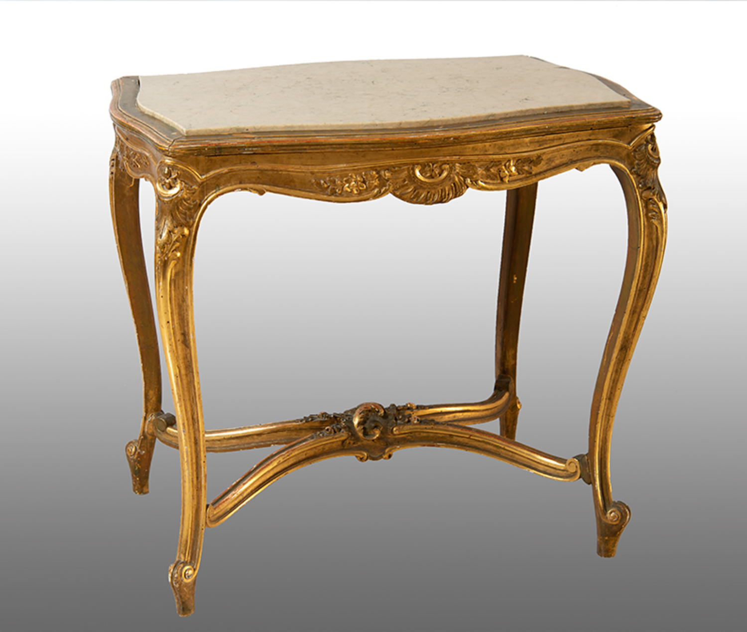 Il piano in marmo è retto da quattro piedi terminanti a ricciolo e collegati da una crociera con al centro una cimasa.