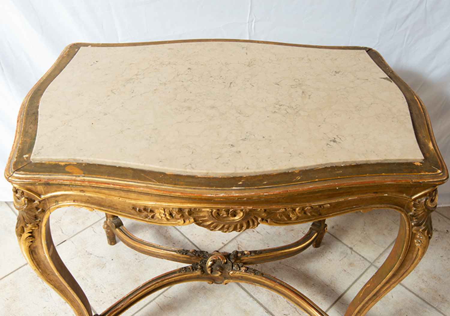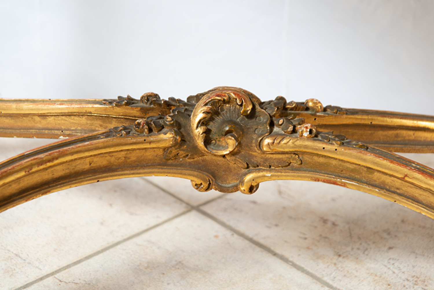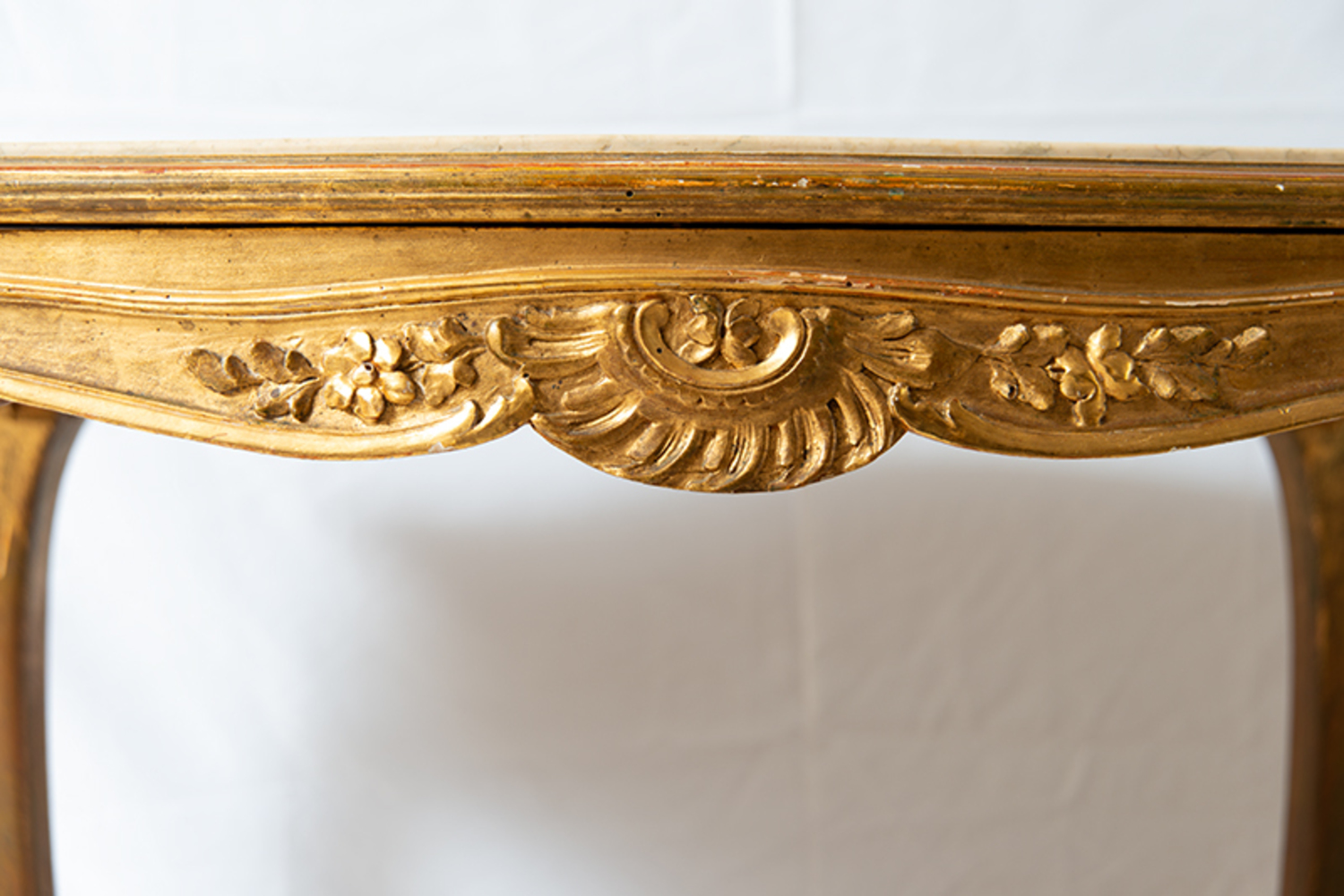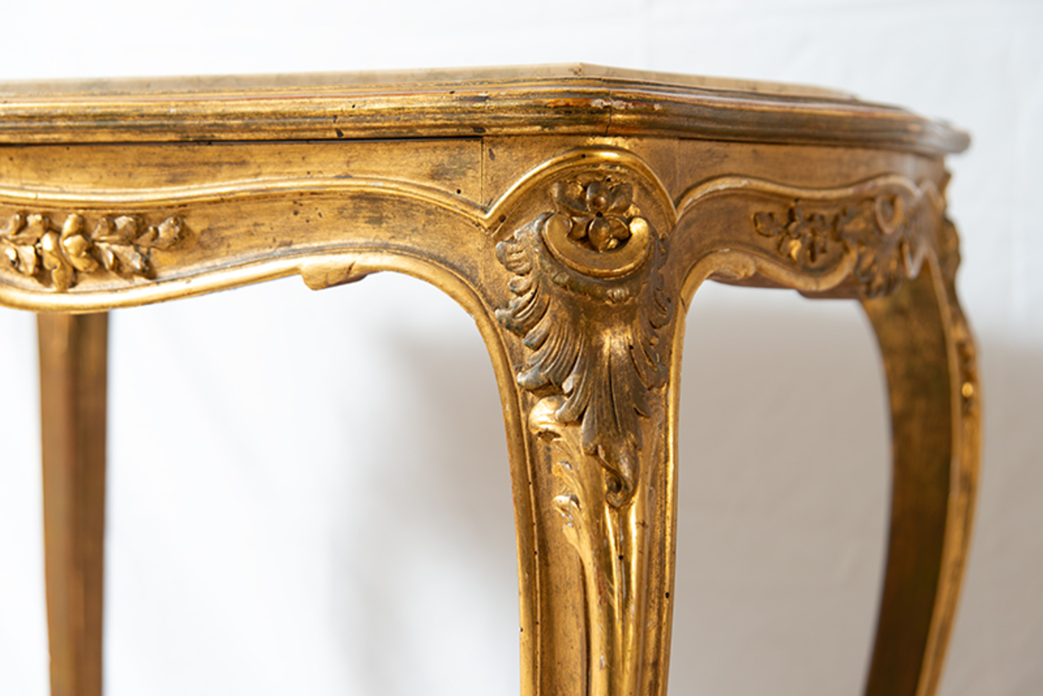 Tavolino Napoleone III Francese in legno dorato e intagliato risalente alla seconda metà del XIX secolo.
