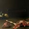 Dipinto olio su tela, periodo XVIII secolo, raffigurante Natura morta con animale macellato e frutta.