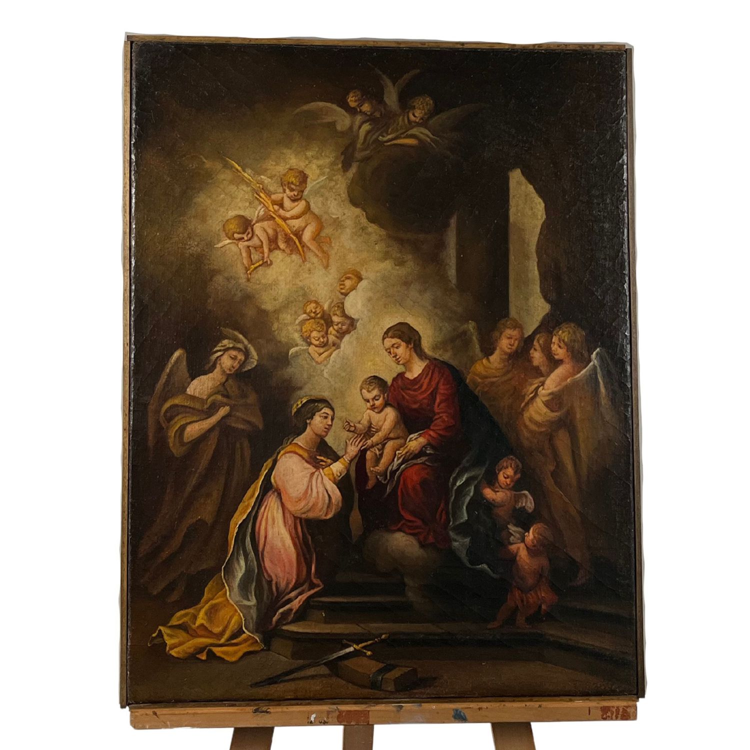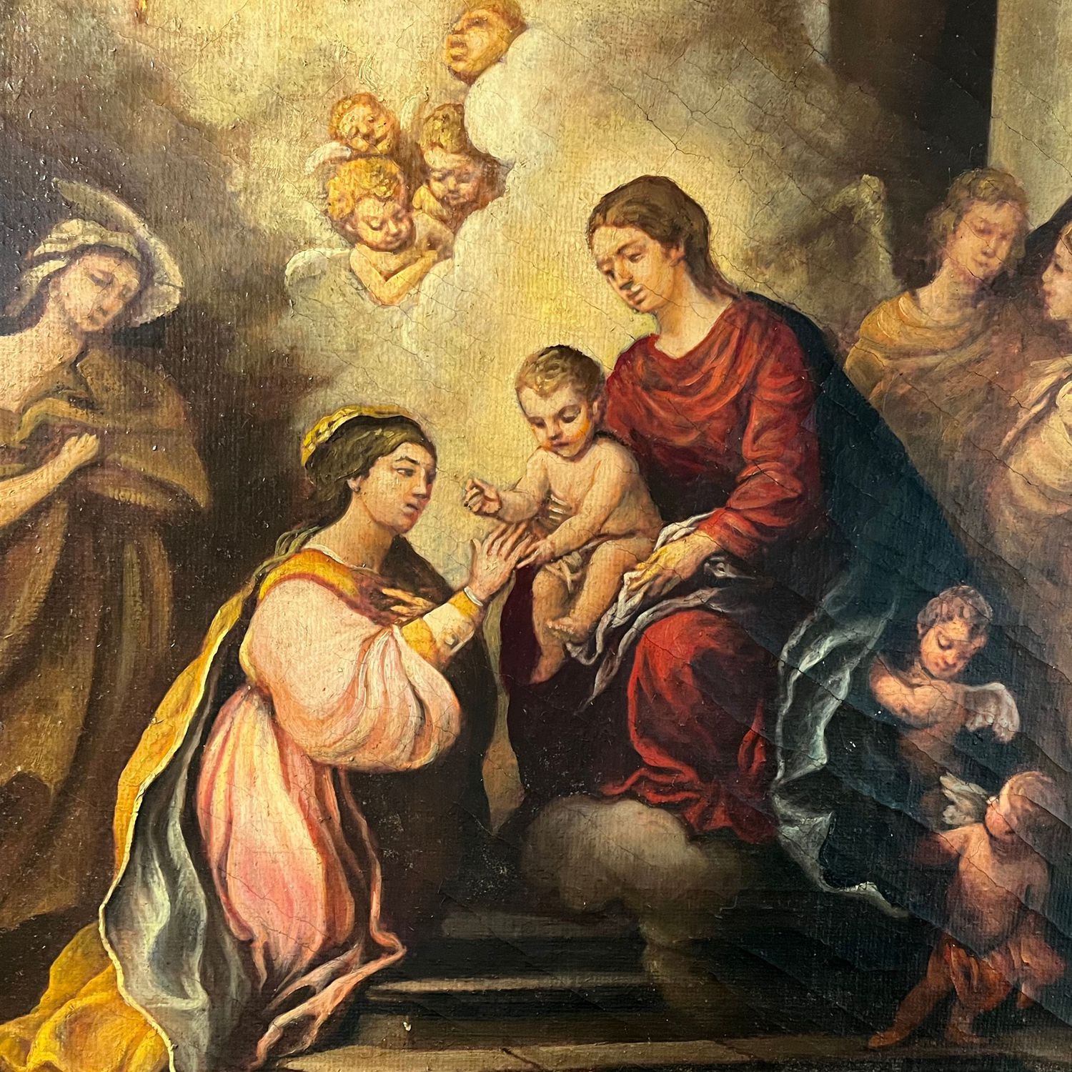 Dipinto olio su tela da artista anonimo del XIX/XX secolo di scuola Francese, raffigurante Il matrimonio mistico di Santa Caterina, tratta da Bartolomé Esteban Murillo.