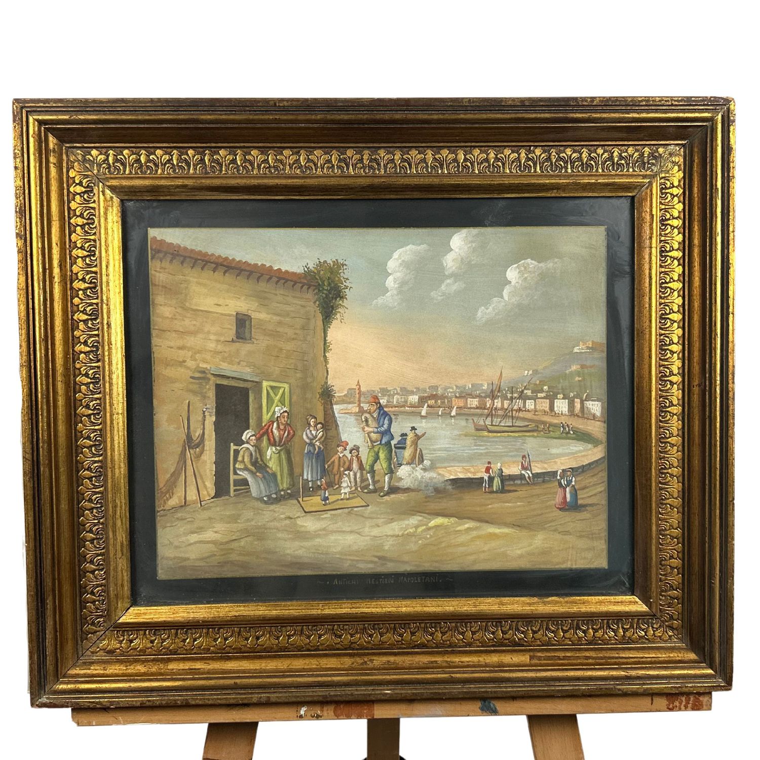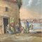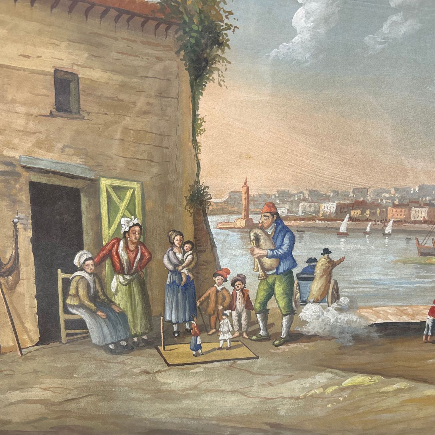 Dipinto Guazzo (tempera su carta) periodo XX secolo scuola Italiana raffigurante Veduta di Napoli e antichi mestieri napoletani.