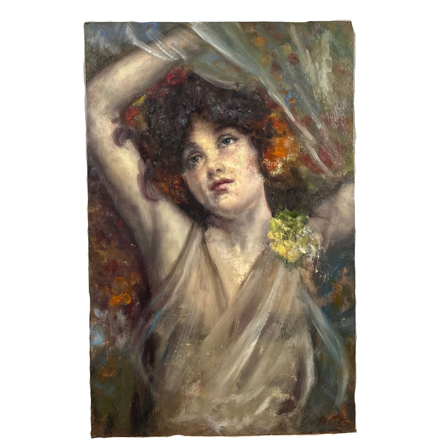 Dipinto olio su pannello periodo XX secolo scuola Italiana raffigurante Ritratto di Donna con velo bianco.