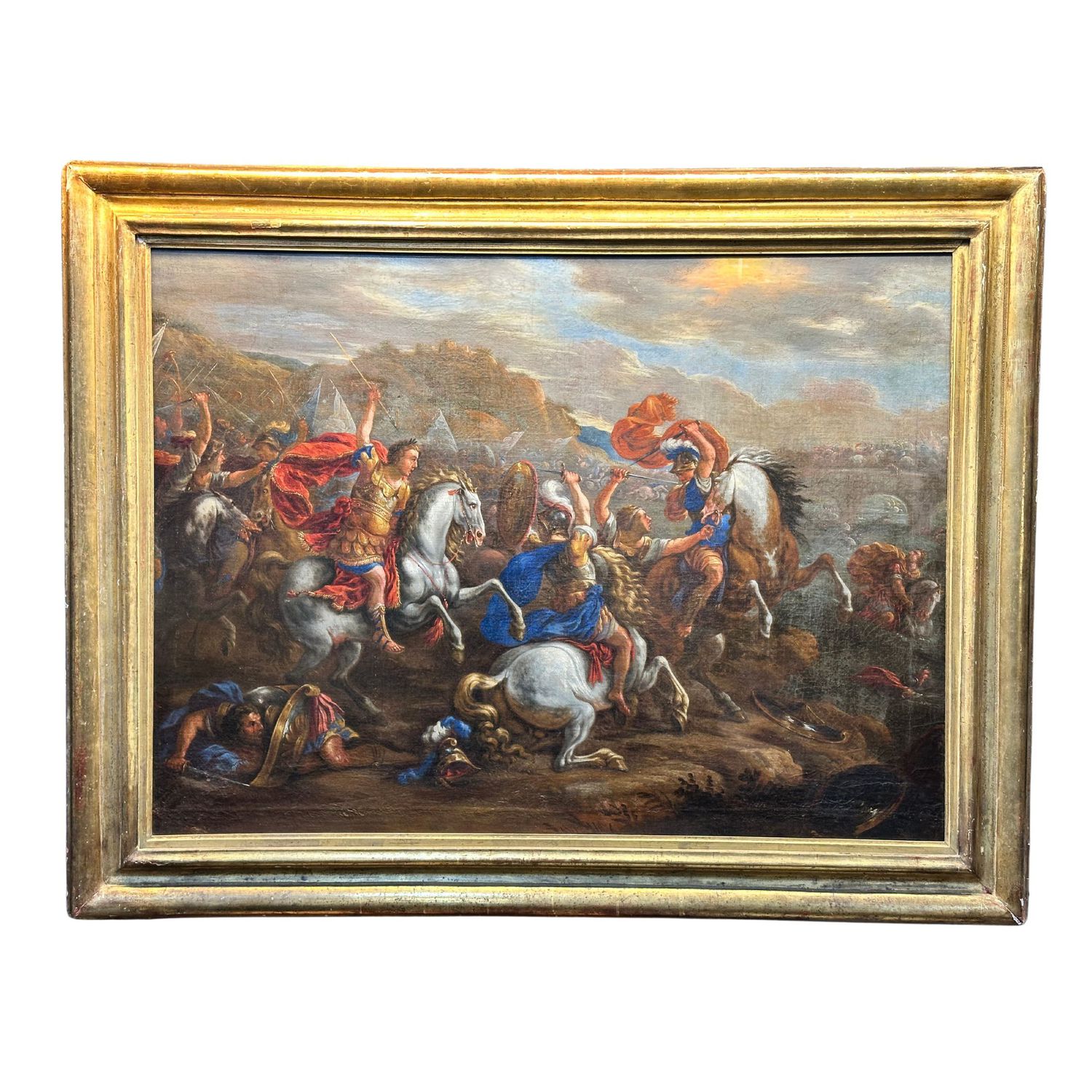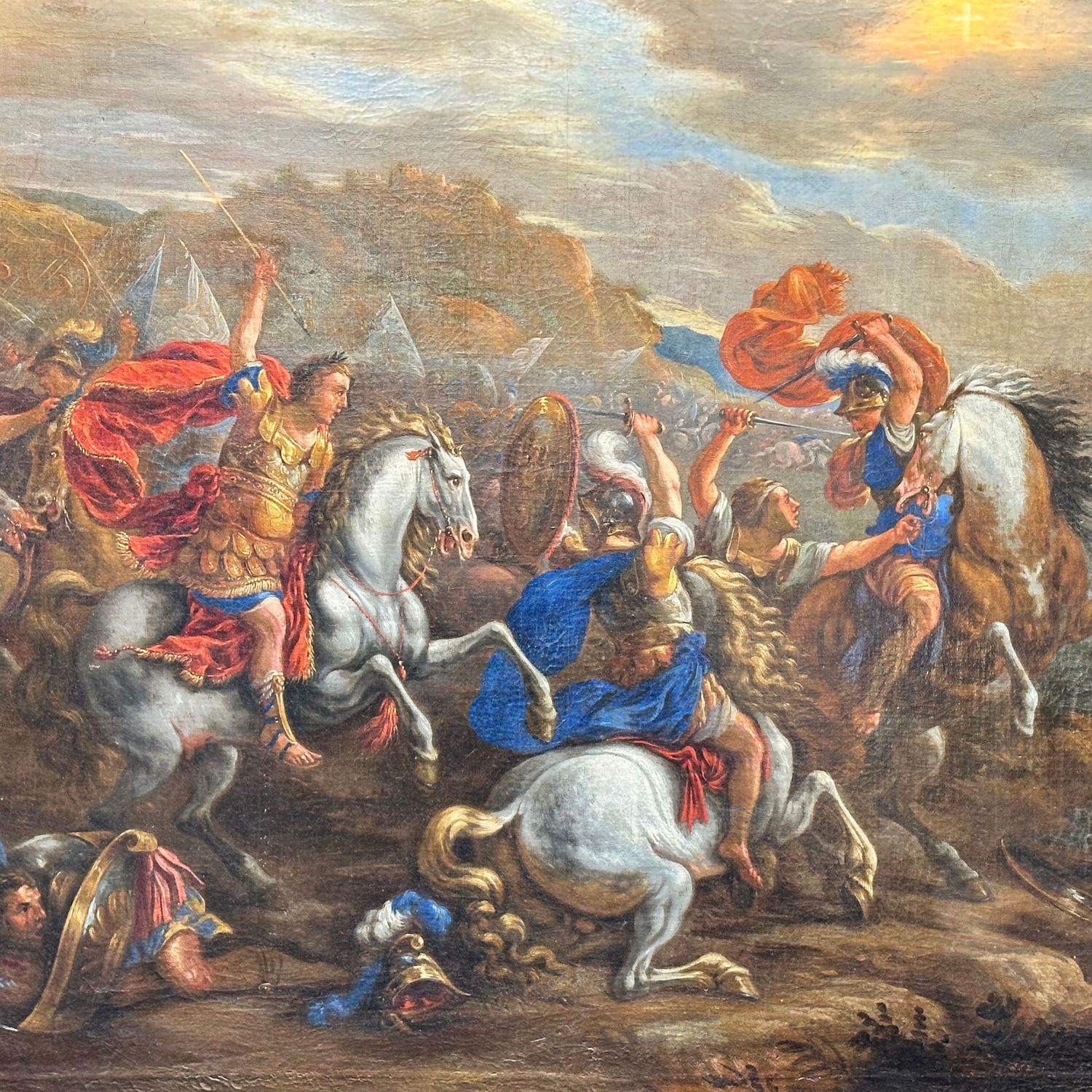 Il dipinto, ascrivibile alla produzione di Vincent Adriaenssen, raffigura lo storico passaggio del ponte su Rubicone avvenuto nel gennaio del 49 a.c. che decretò Giulio Cesare come nemico della Res Publica e, come tale, avversato e attaccato dalle truppe di Pompeo.