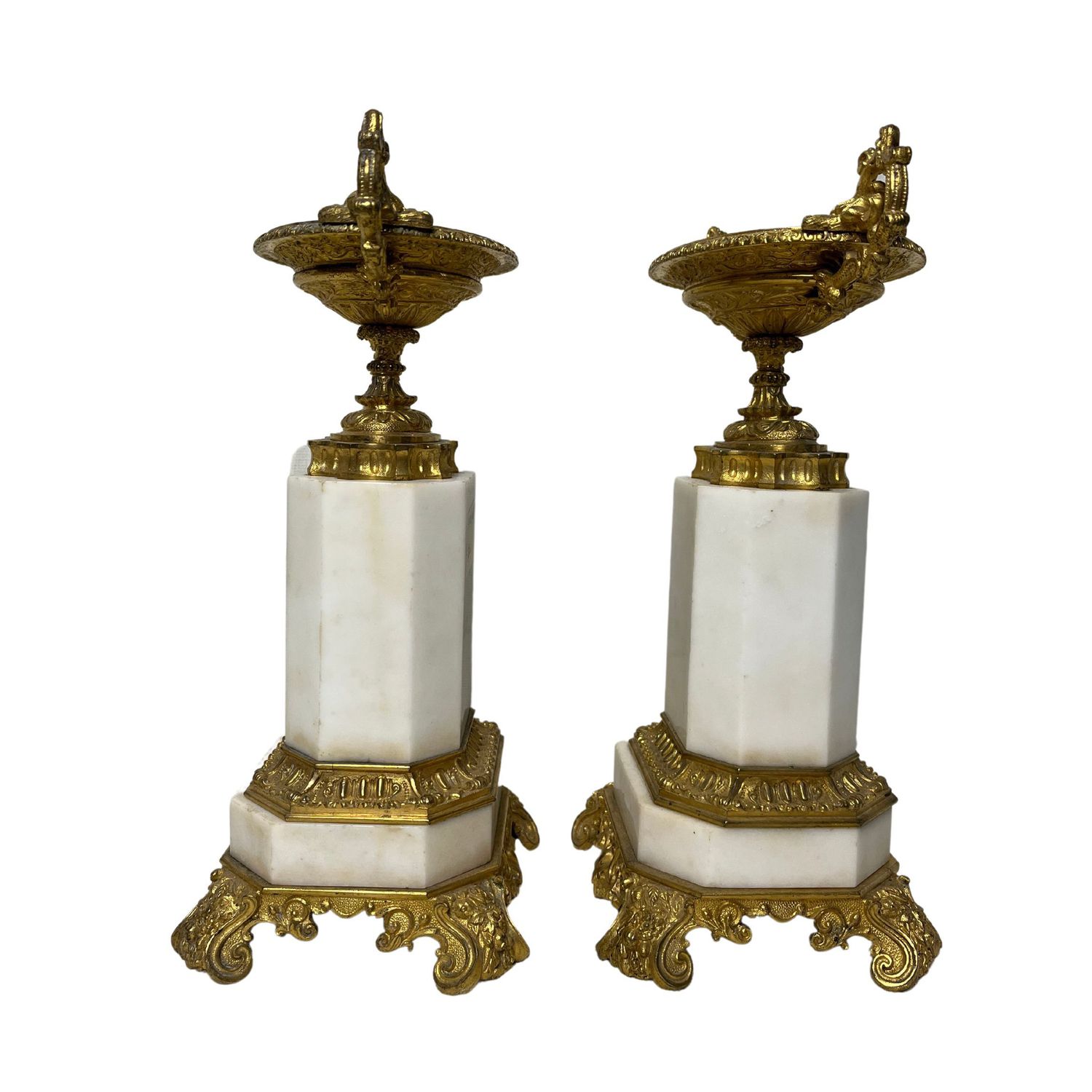Coppia di alzate in bronzo dorate, finemente cisellato, sorrette da basi in marmo bianco. Periodo XIX secolo.