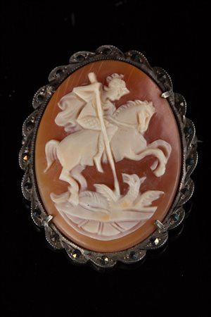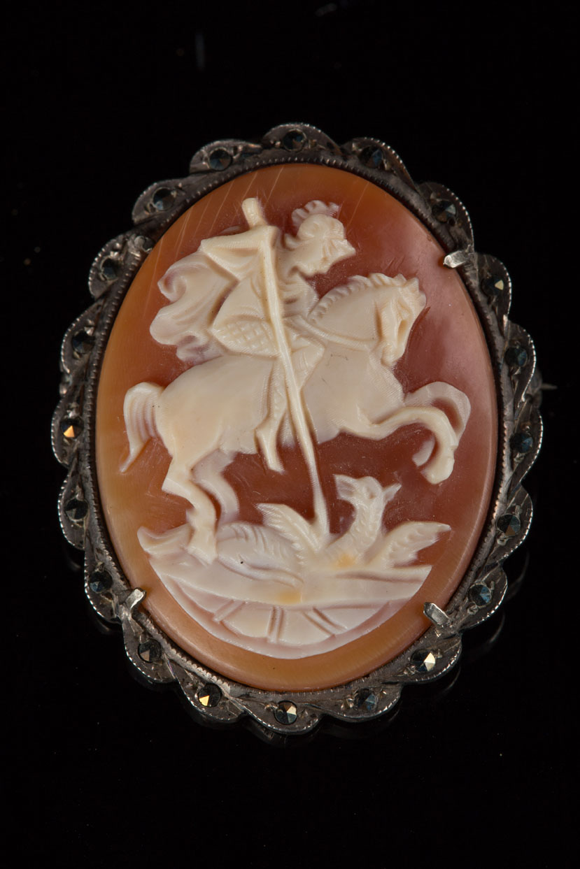 A cameo set in a worked silver frame (800) depicting the famous scene of St. George and the dragon.