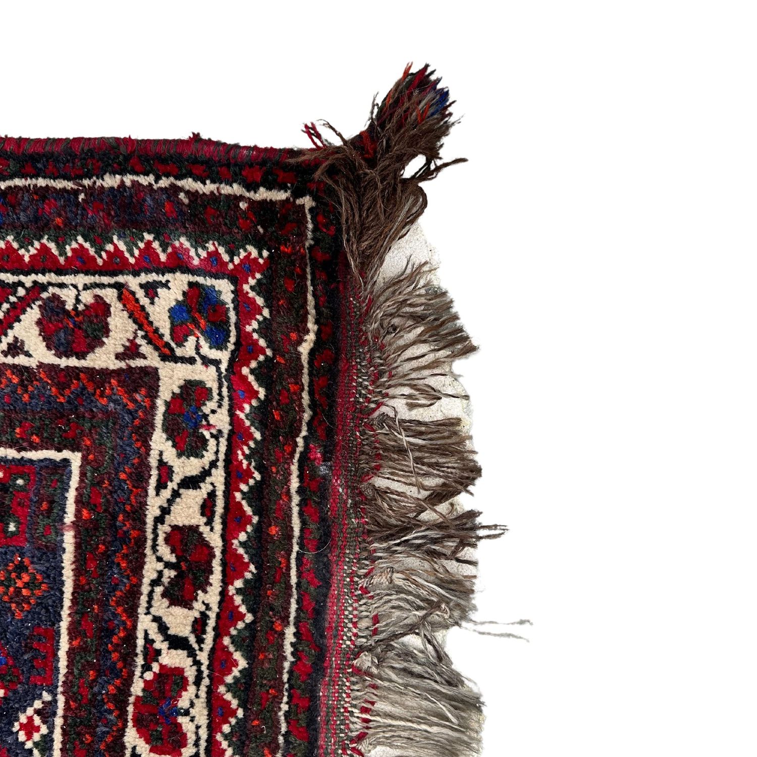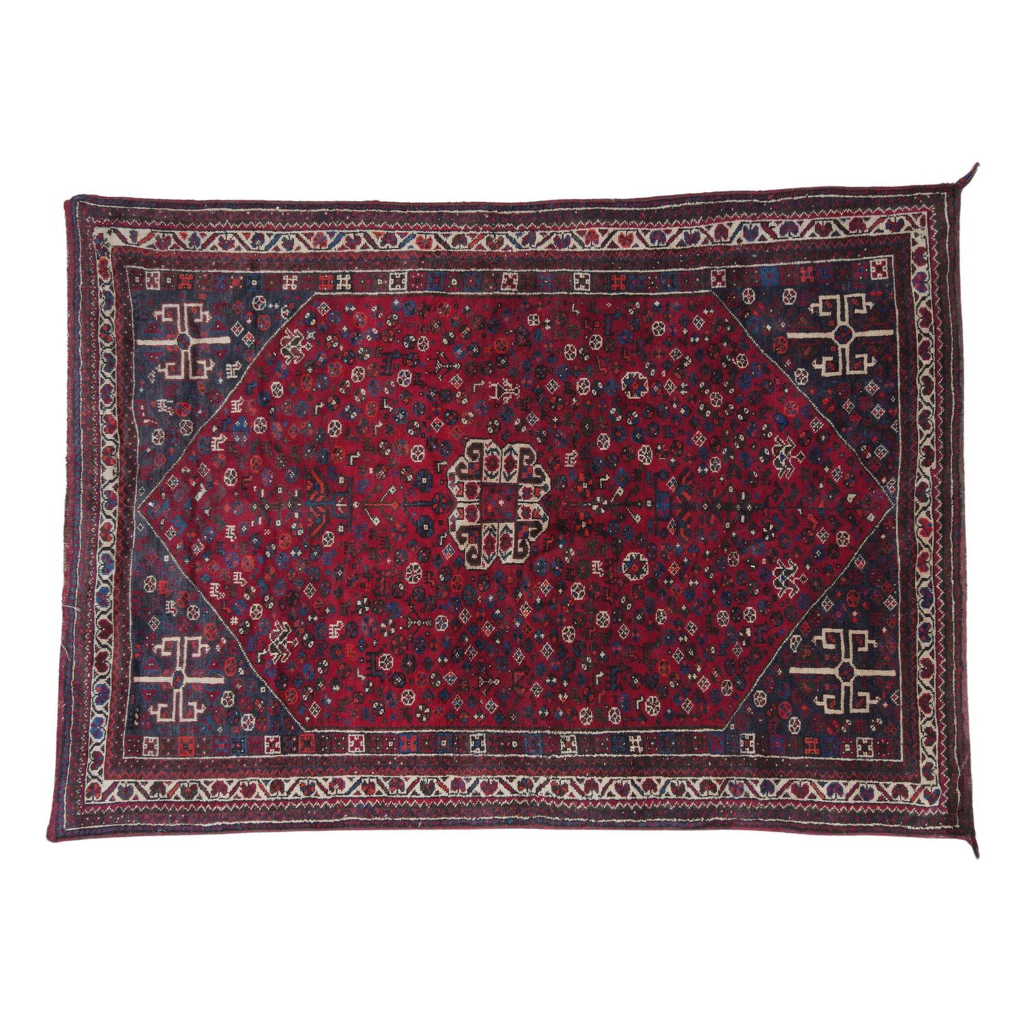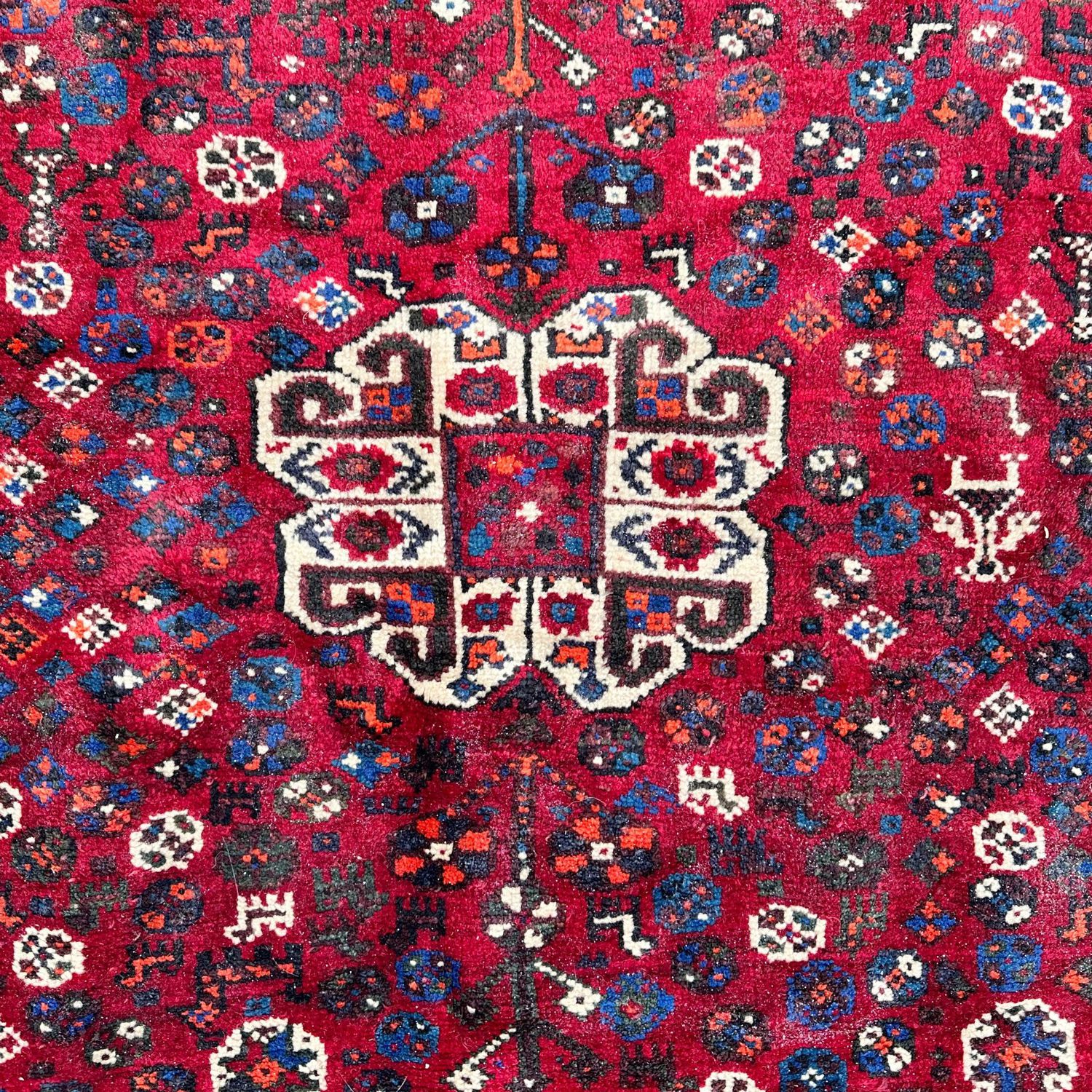 Tappeto in tessuto bordeaux. Dimensioni: 253x182 Segni di usura e macchie...