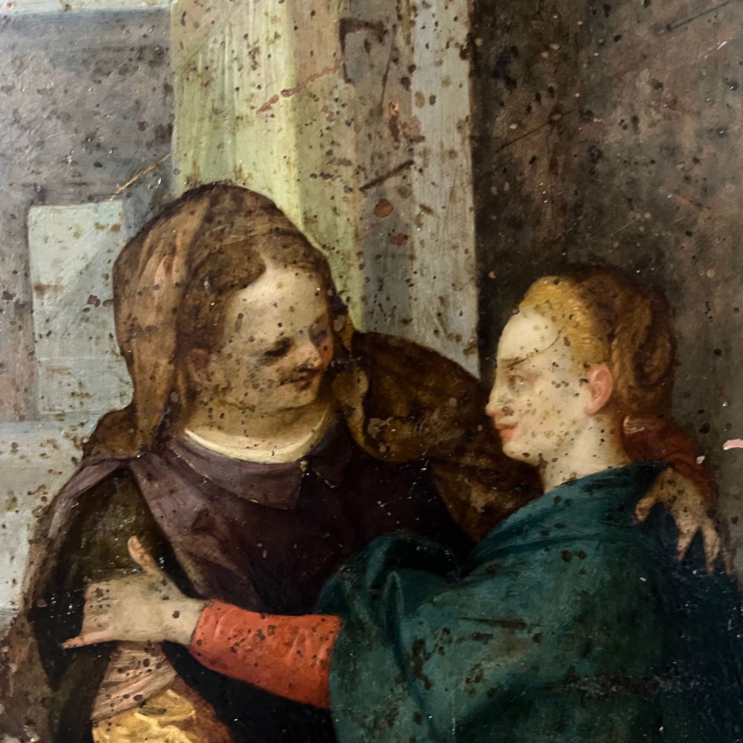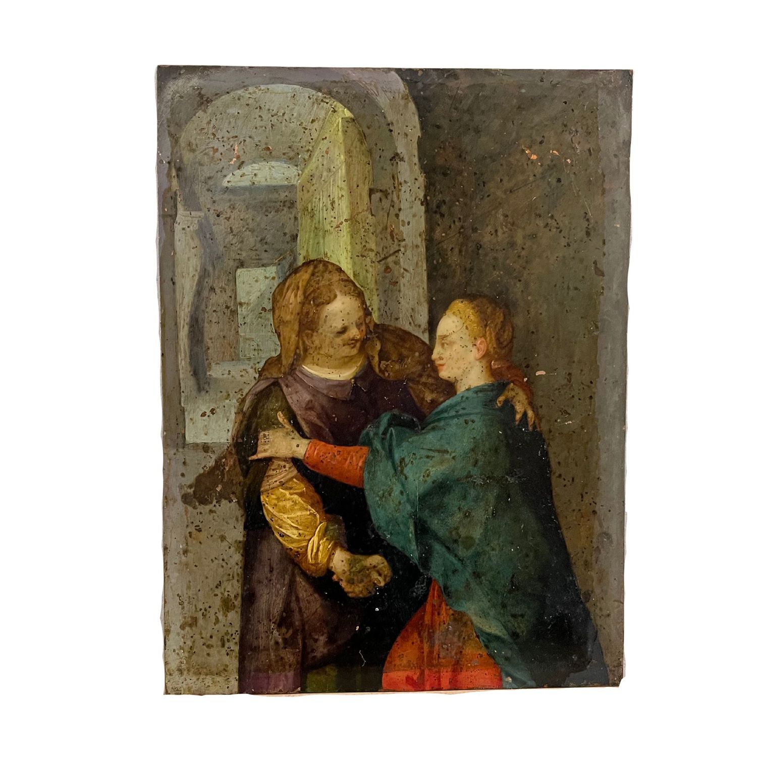 Dipinto olio su rame, scuola Italiana raffigurante Visitazione di Maria a Elisabetta. Periodo XVIII secolo.