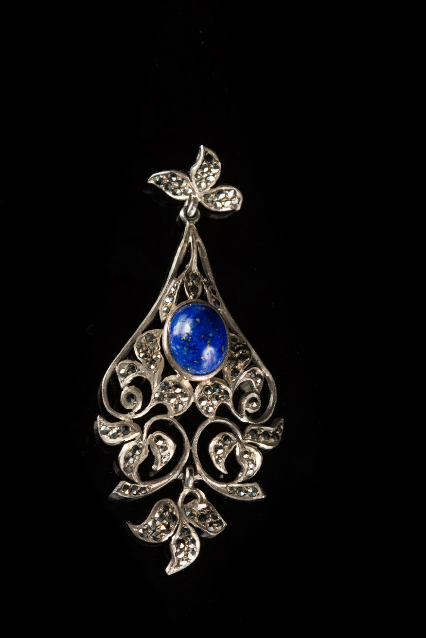 An elegant silver pendant (800), Florentine craftsmanship embellished with a pavé of marcasite and a cabochon cut lapislazuli in the centre.