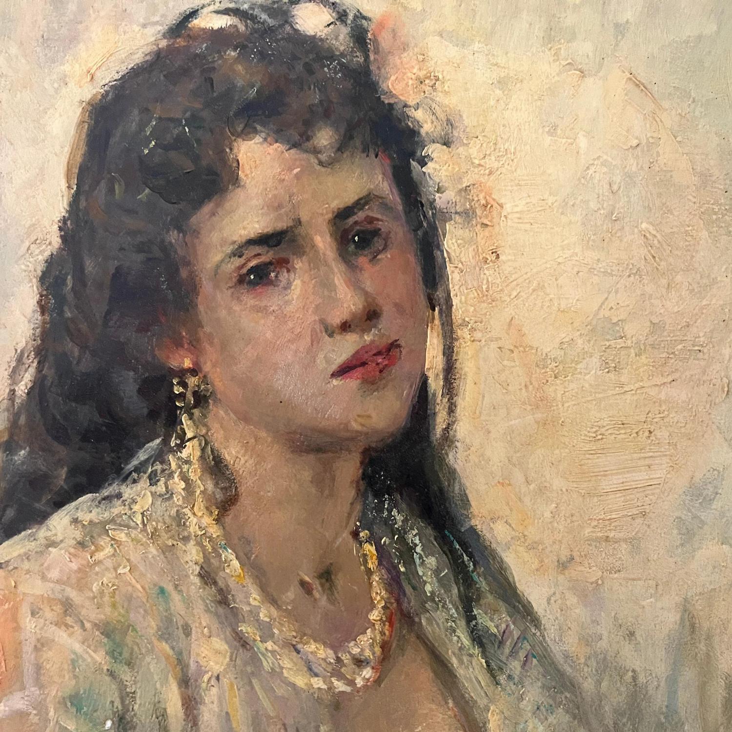 Dipinto olio su pannello di legno, raffigurante ritratto di donna a mani giunte, periodo XX secolo. Copia da Katharine Carl 1865-1938
