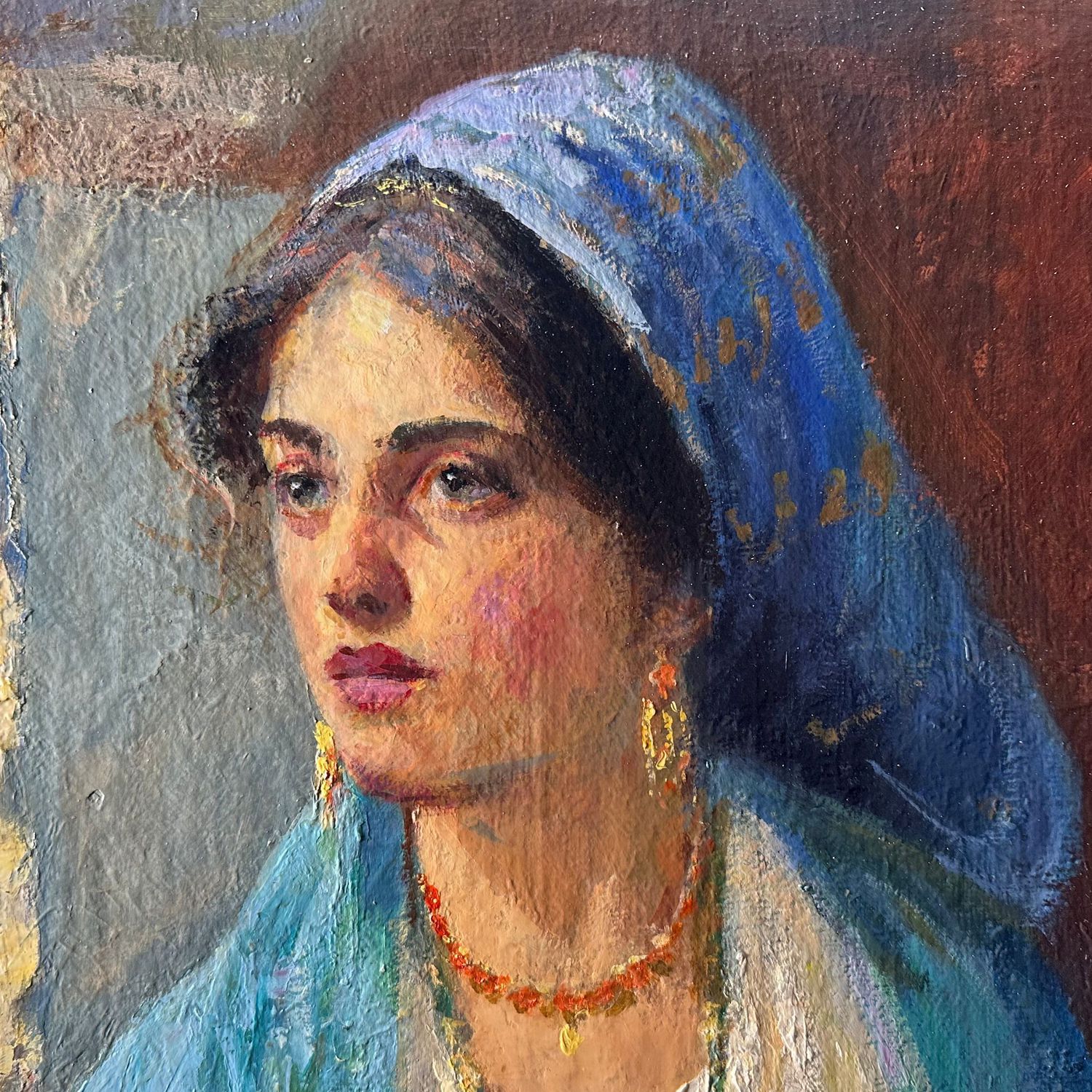 Dipinto olio su tela scuola Italiana periodo XIX secolo, raffigurante Donna coperta da fazzoletto blu.