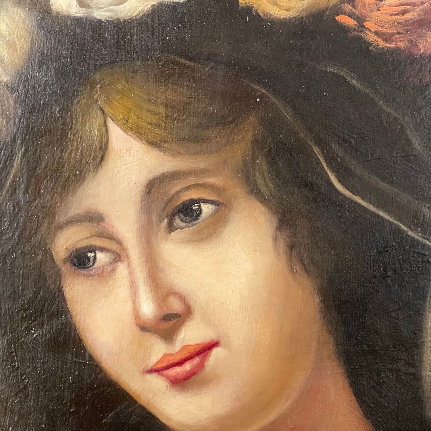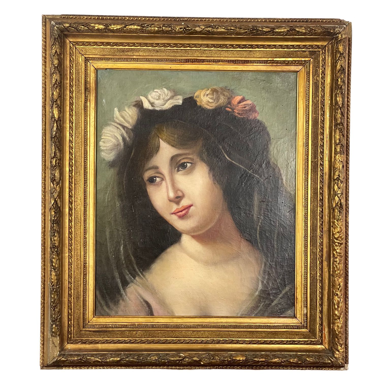 Dipinto olio su tela raffigurante Ritratto di donna con capo ornato da fiori. XIX/XX secolo.