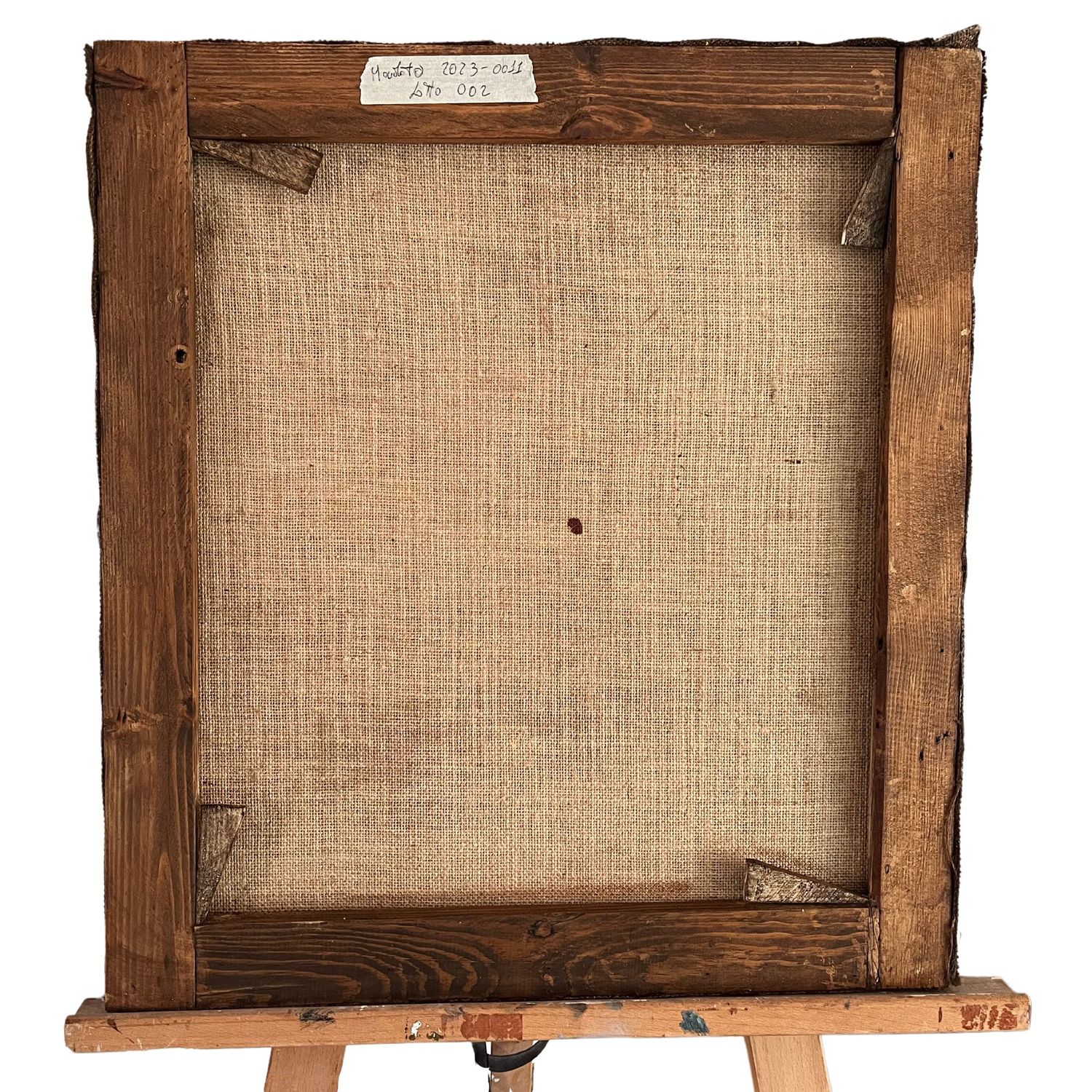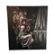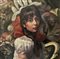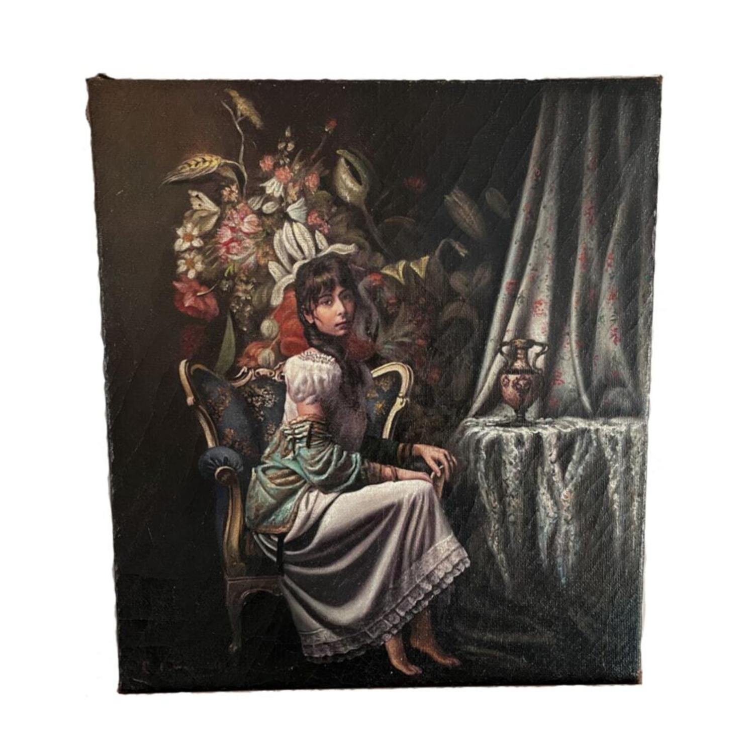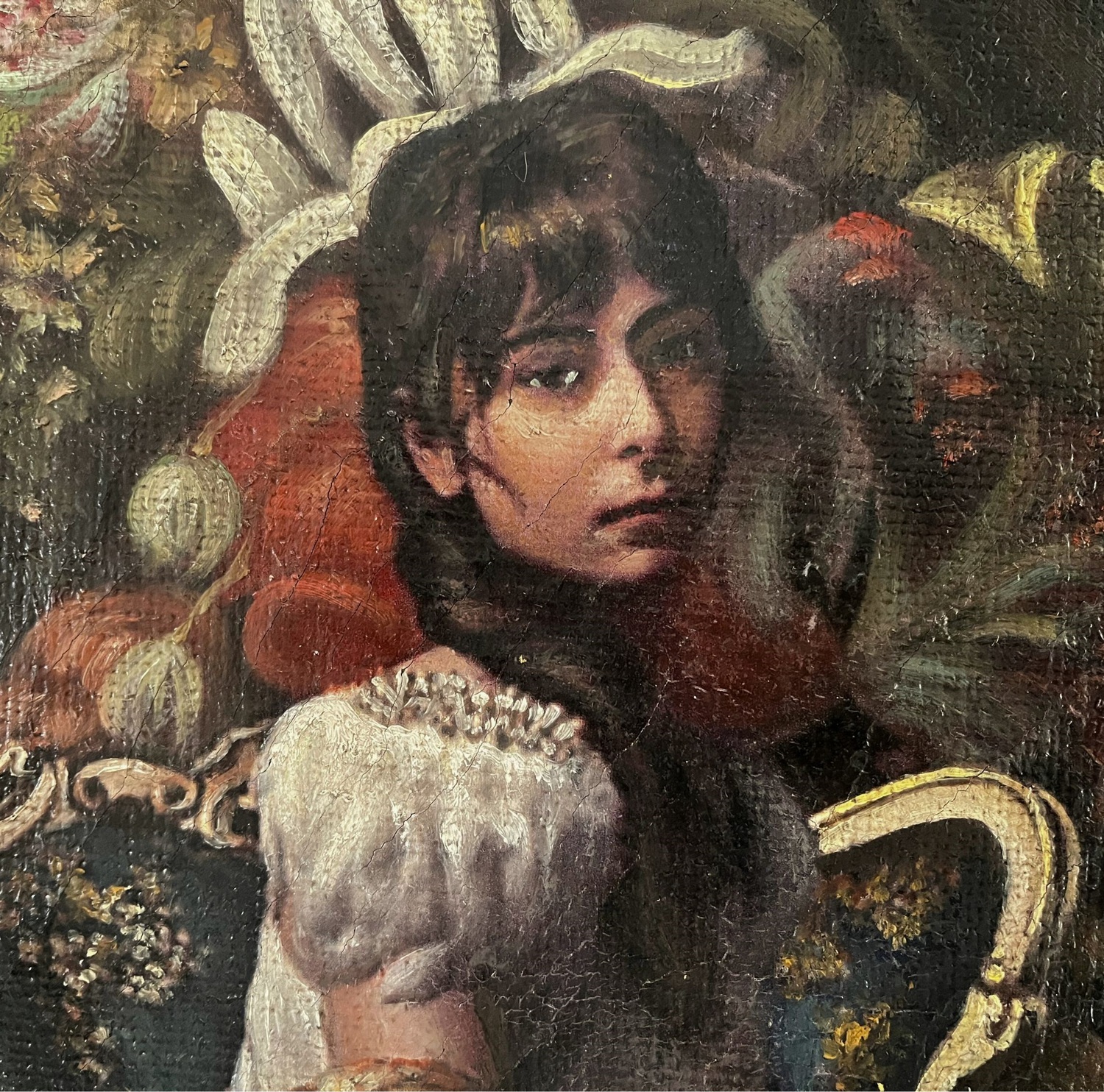 Dipinto olio su tela, raffigurante ritratto di donna seduta su poltrona con sfondo ornato da vaso con fiori. Scuola Europea XX Secolo.
