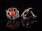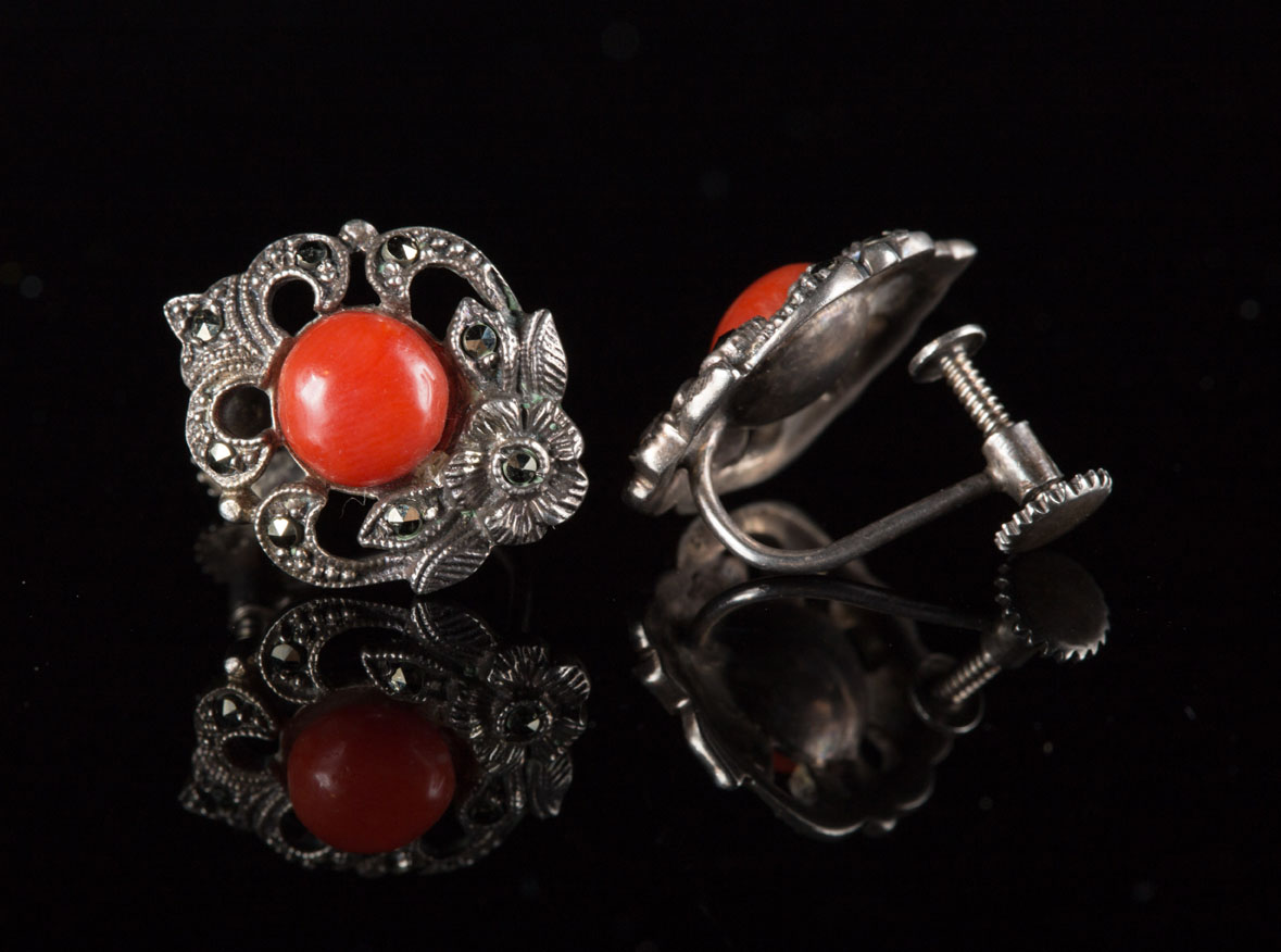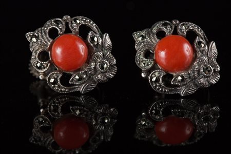 Elegant silver earrings (835) embellished by centrally set marcasite and red coral.