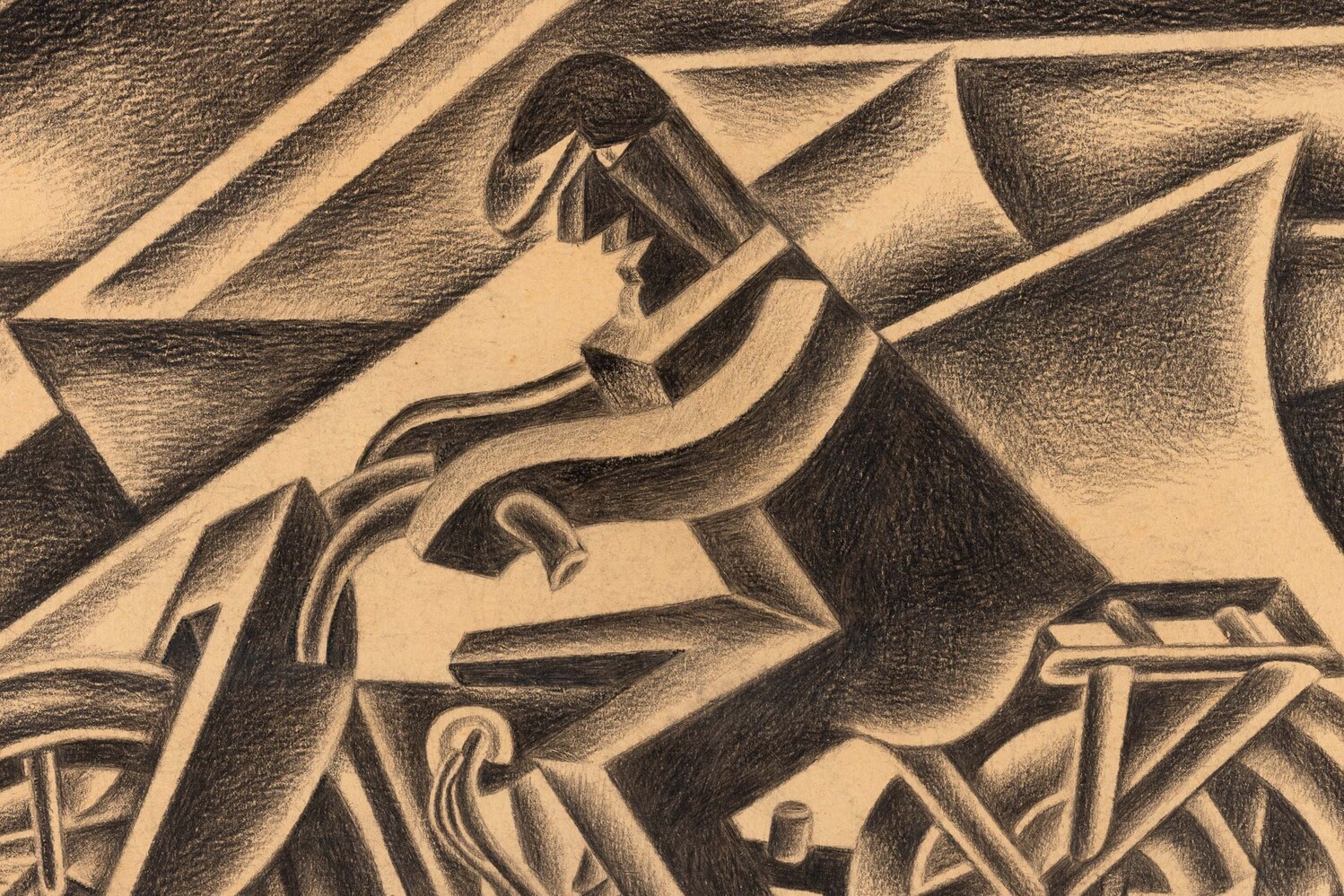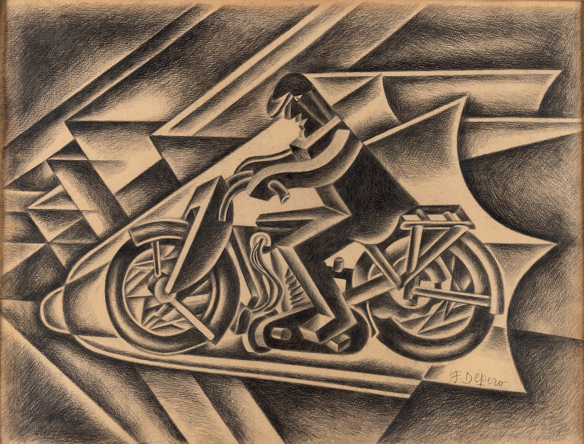 Opera registrata presso l'Archivio Unico per il Catalogo Generale delle opere di Fortunato Depero, Rovereto con il n. FD-4504-DIS in data 10 ottobre 2023 e accompagnato da certificato di autenticità, Collezione privata, Roma, Nel 1922 Pannaggi e Paladini, cui si aggiunse quasi subito Prampolini, lanciarono il "Manifesto dell'Arte Meccanica futurista*, Depero non fu tra i firmatari, ma aderi immediatamente nei fatti... lui che era stato il primo futurista meccanico nel 1918 con gli automi dei "Balli Plastici". E quindi, e purtroppo limitatamente al biennio 1922-1923, Depero realizzò le uniche opere veramente meccaniche e dinamiche nell'ambito della sua lunga carriera, e cito sopratutto il "Ciclista veloce*, del 1922, e, appunto, il "Motociclista*, altrimenti anche titolato "Solido in velocità". Il presente disegno è uno studio finale per l'ambientazione del Motocilcista in quella specie di, galleria del vento che sono i "cunei di velocità*, cioè gli effetti della penetrazione della moto nell'aria. Depero ne realizzò altre versioni nel corso degli anni, sia a matita, sia a carboncino, e infine, nel 1943, realizzò una versione a carboncino pieno con ritocchi a biacca. Quest'ultima versione servi poi per la realizzazione di una litografia nel 1944. Insomma, un bel disegno del miglior Depero 'meccanico', 'dinamico" e 'futurista"., (dal testo di archiviazione di Maurizio Scudiero)