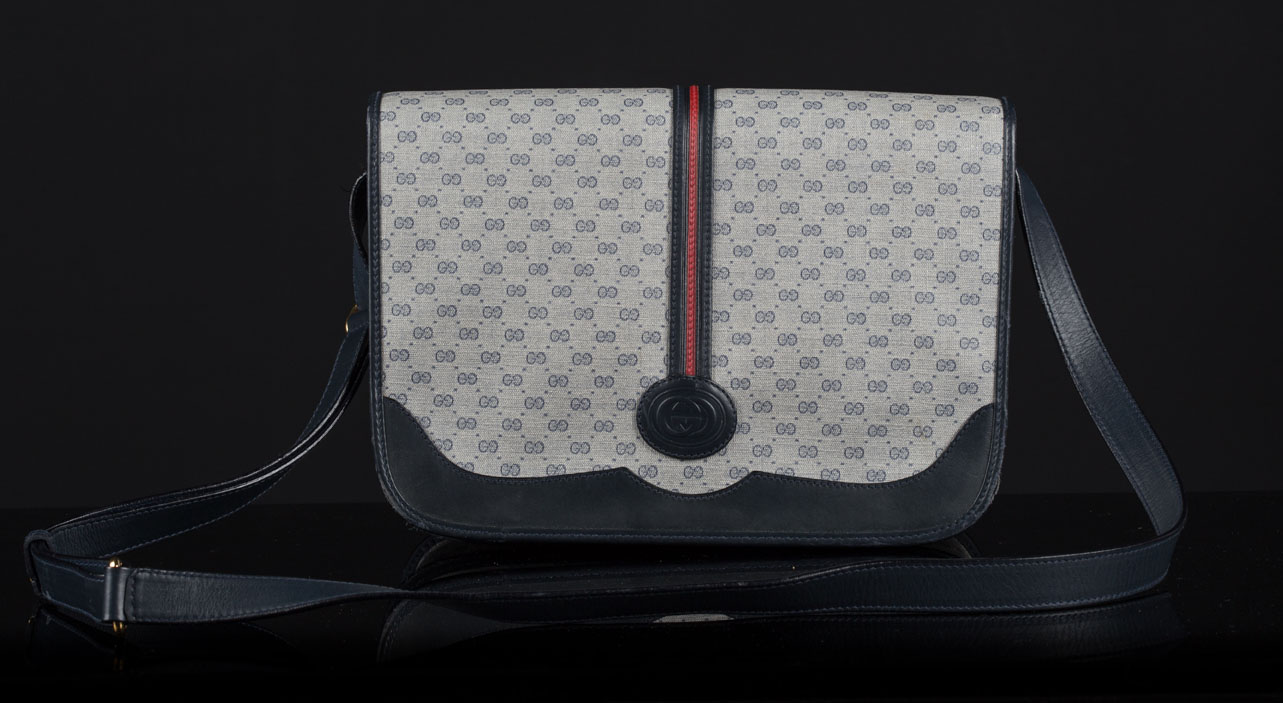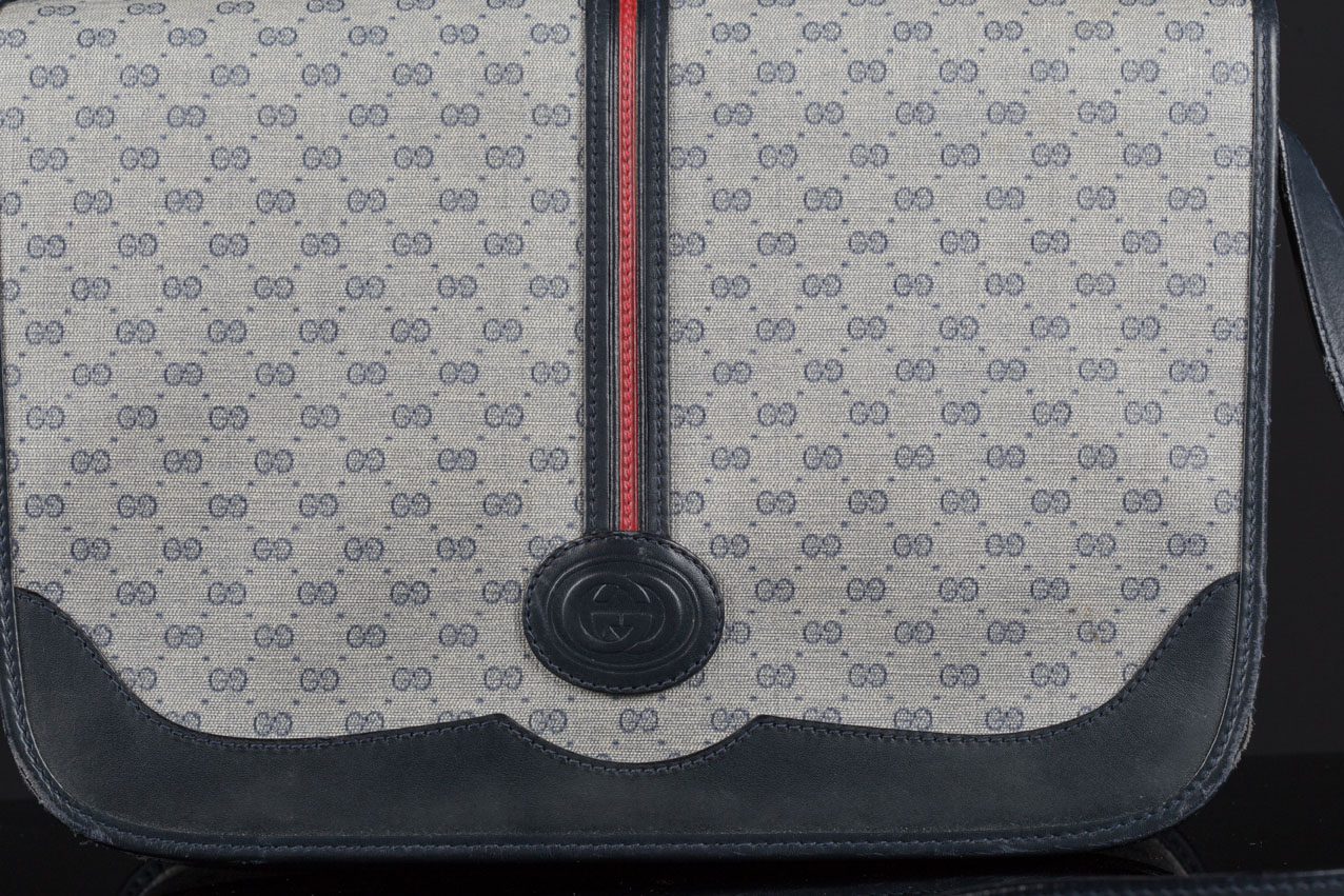 A waxed fabric bag impressed with the classic Gucci logo, trimmings and 50 cm shoulder strap are in navy blue leather. The interior presents a zip pocket with the tag representing the logo that was introduced in the 1950's of the knight with the suitcases. the centre of the pocket bears the Gucci trademark detail with an engraved gilt plaque "Gucci made in Italy"