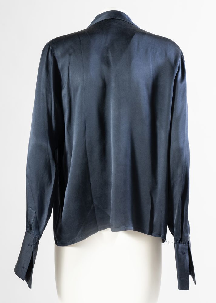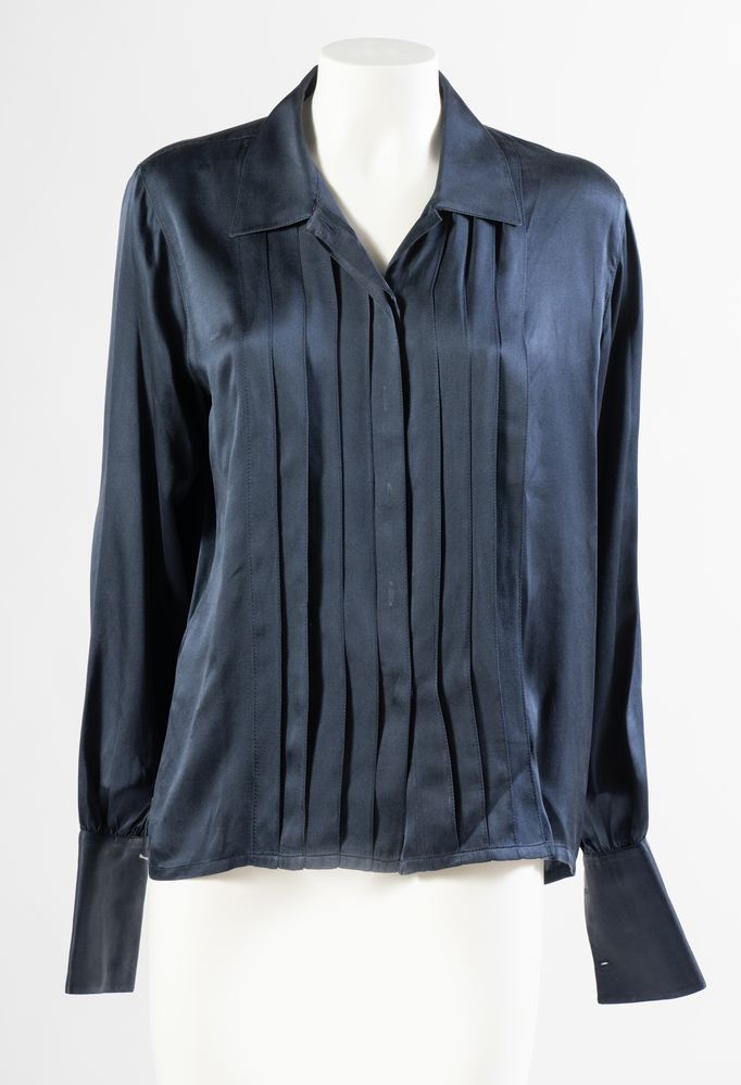 CHANEL Camicia in raso di seta blu plissettata sul davanti. Taglia riportata: IT 42. Composizione 100% seta. Reca marchio Chanel.
