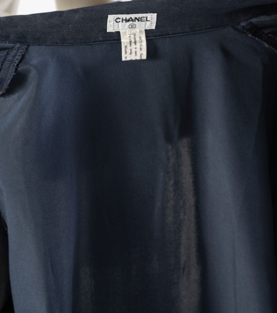 CHANEL Camicia in raso di seta blu plissettata sul davanti. Taglia riportata:...