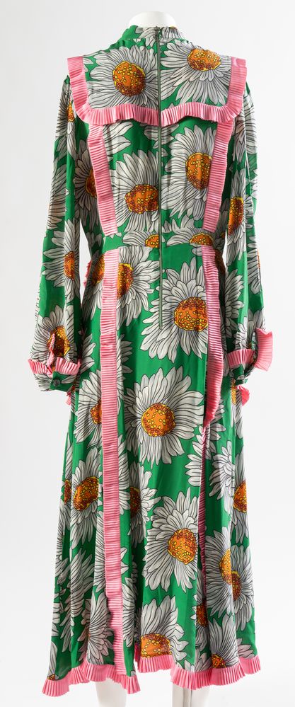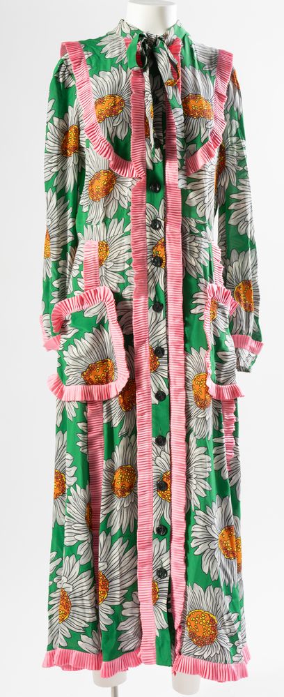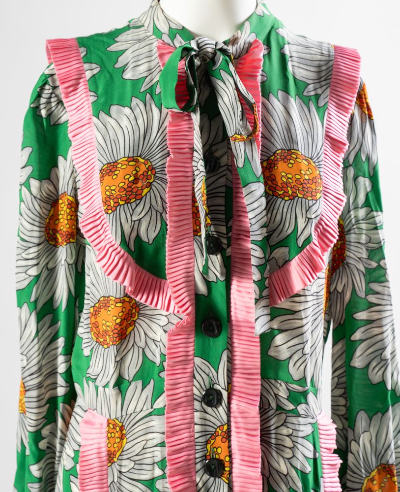 GUCCI Rarissimo abito da passerella in seta a fantasia floreale e rouge fucsia. Spring/Summer 2017. Taglia riportata: IT 40. Composizione esterno 100% seta; dettagli 50% cotone, 50% viscosa; decorazioni 90% cotone, 10% poliammide; fodera 75% acetato, 25% seta. Reca marchio Gucci. Corredato di scatola.