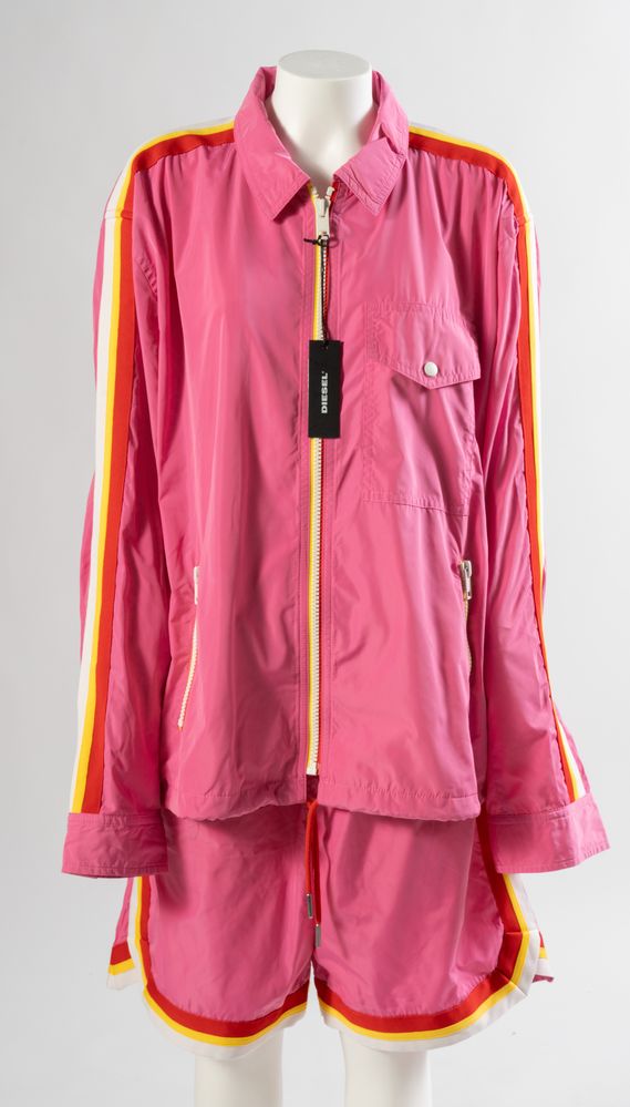 DIESEL Completo sportivo giacca e pantaloncino in tessuto tecnico rosa. Al retro presenta stampa di tigre. Taglia riportata giacca: XXL; pantaloni: L. Composizione giacca e pantaloni: 100% polyester. Reca marchio Diesel. (nuovo)