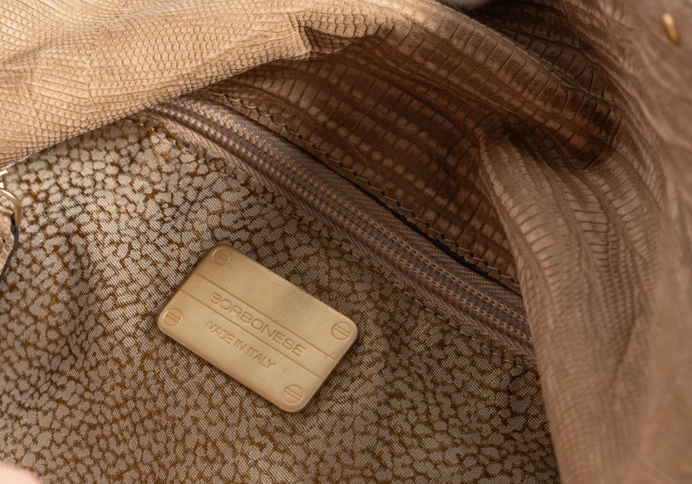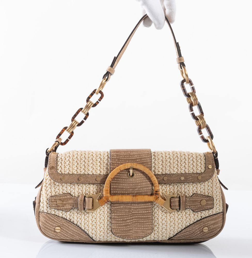 BORBONESE Borsa modello Baguette in rafia, con dettagli in pelle stampata pitone, metallo dorato e bamboo. Manico in pelle, metallo e resina. Cm 17x37x8; altezza con manico cm 40. Reca marchio Borbonese, Made in Italy.