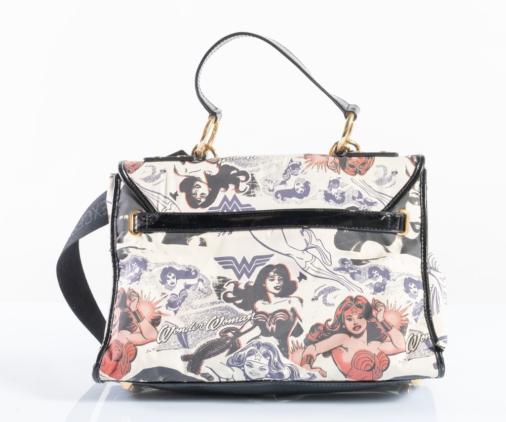 REDWALL Borsa a mano in tela a tema Wonder Woman. Rifiniture in metallo dorato e tracolla regolabile. Cm 26x33x13; altezza con tracolla cm 74. Reca marchi Redwall e Wonder Woman, Comics.