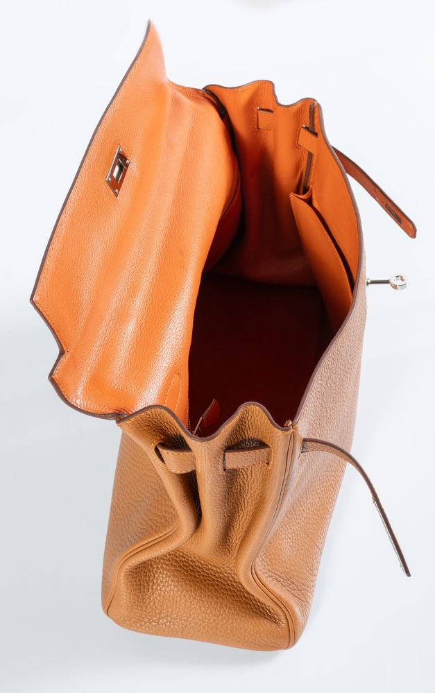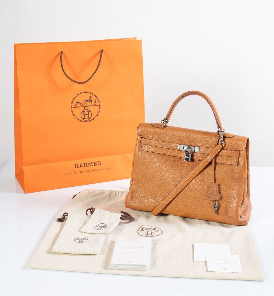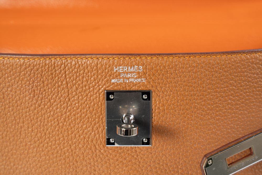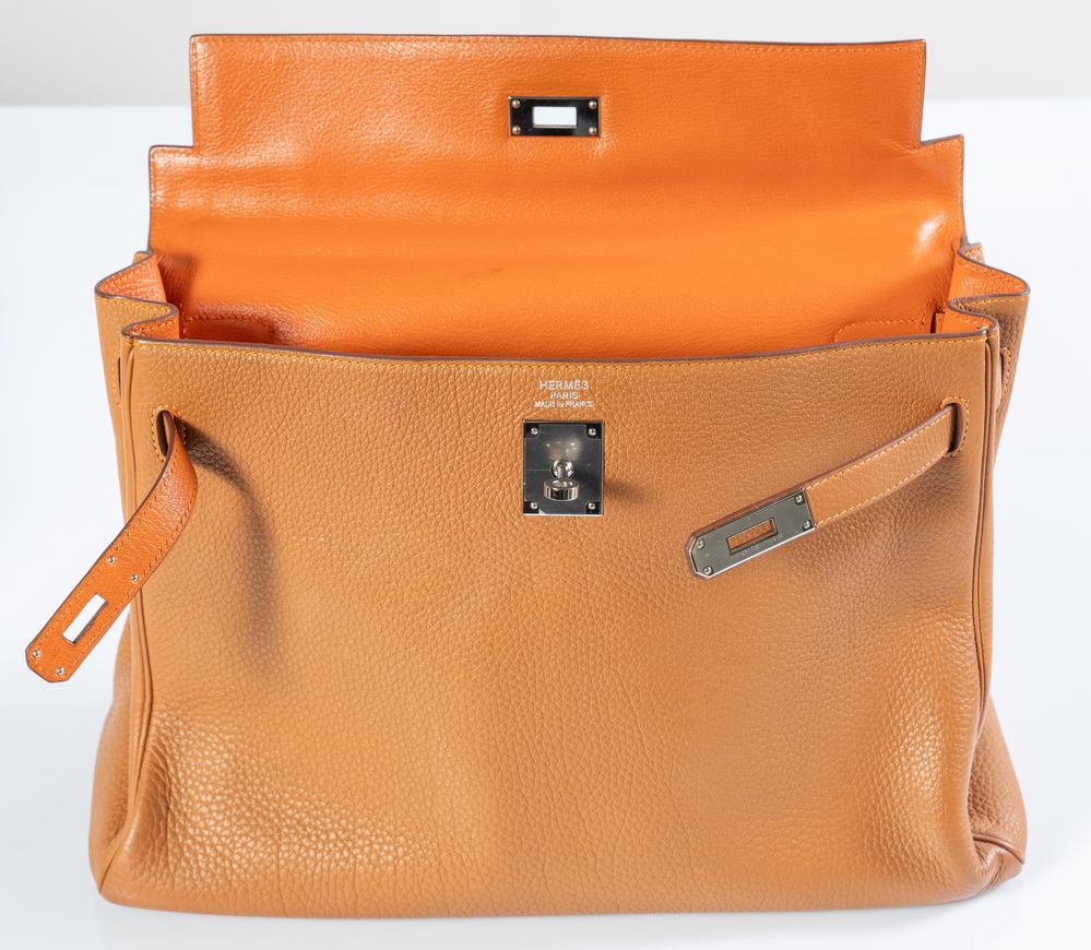 HERMES Borsa a mano modello Kelly 32 bicolore in pelle togo gold. Cuciture a punto sella a contrasto nel colore arancione della Maison. Anno 2010. Cm 25x32x13; altezza con manici cm 36. Tracolla removibile di cm 90. All'interno reca una tasca con chiusura a zip e due tasche. Completa di lucchetto, clochette e chiavi. Corredata di dustbag per borsa, tracolla e lucchetto. Corredata di rain protection. Reca marchi H, Hermès Paris, Made in France. (condizioni perfette)