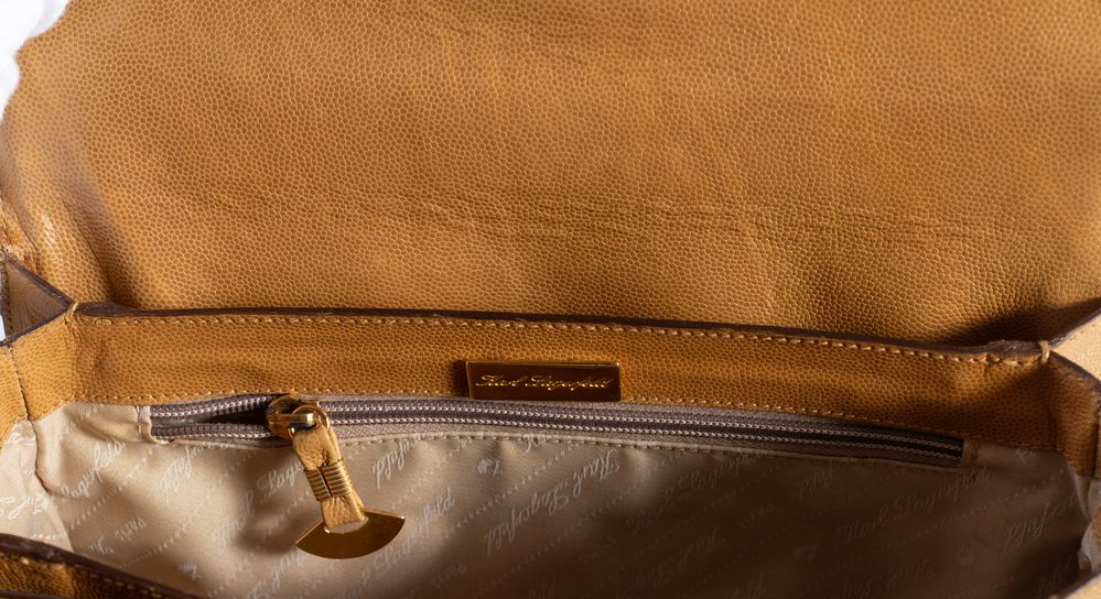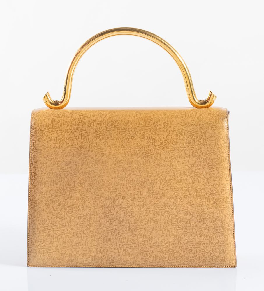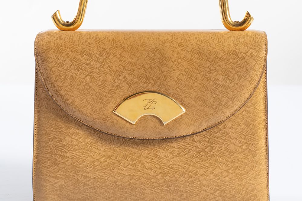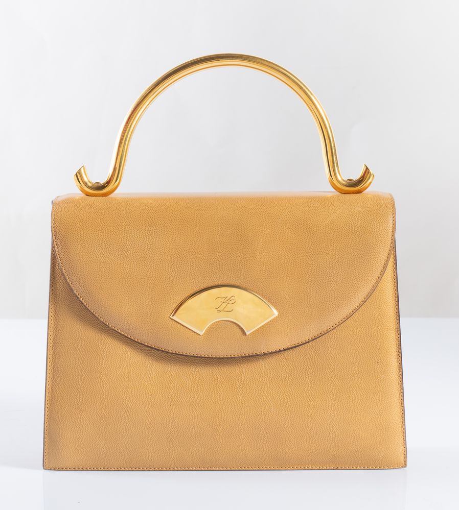 KARL LAGERFELD Borsa a mano modello Kelly in pelle senape. Manico e dettagli in metallo dorato. Cm 31x27,5x6. Reca marchio Karl Lagerfeld.