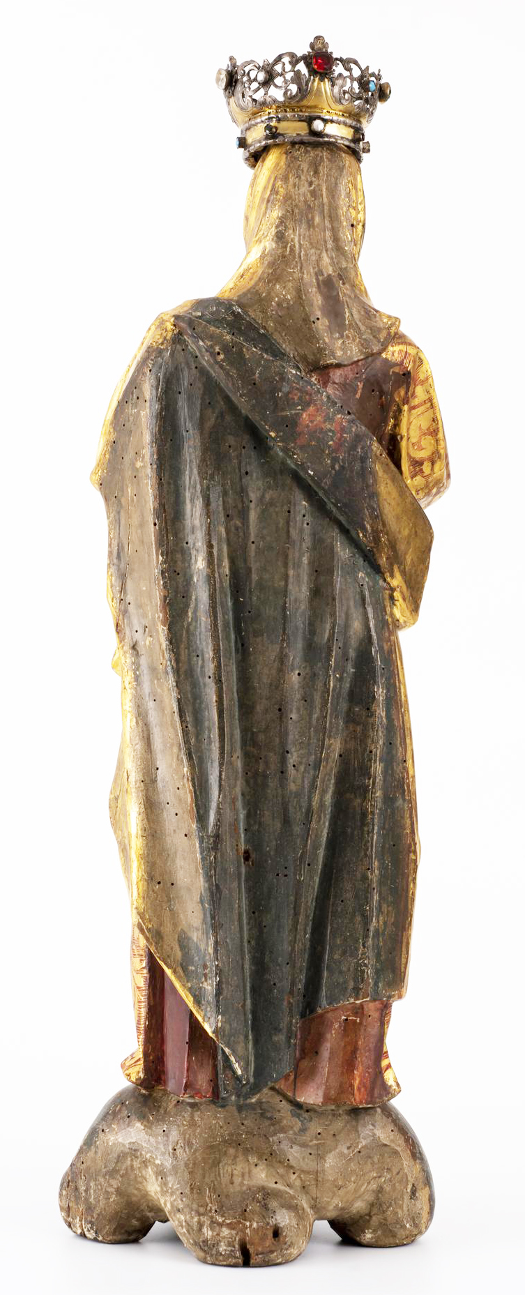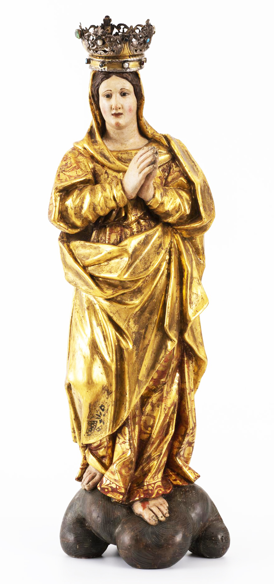 scultura lignea policroma con corona in metallo dorato e pietre dure, h cm 73