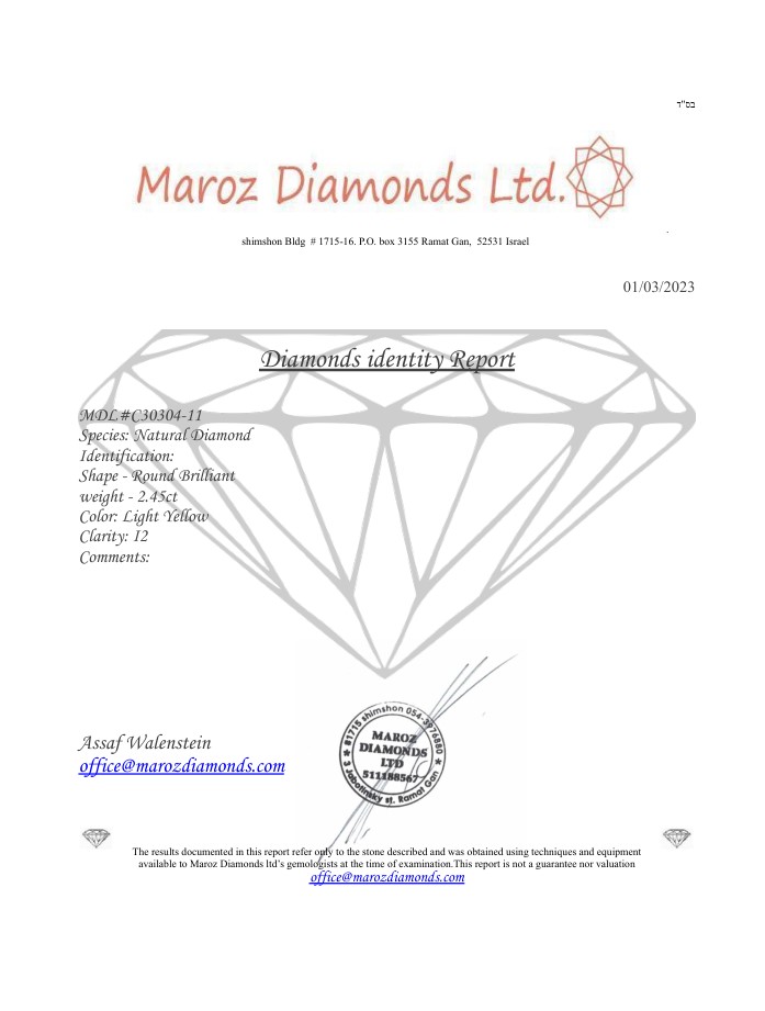 DIAMANTE NATURAL POLISHED 2,45 CARATI COLORE GIALLO CHIARO - PUREZZA I2 - TAGLIO BRILLANTE - CERTIFICATO GEMMOLOGICO MAROZ DIAMONDS LTD MEMBRO ISRAEL DIAMOND EXCHANGE – C30304-11