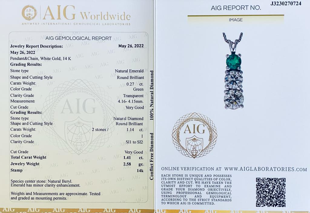 GIROCOLLO IN ORO BIANCO 14K 2.58 GR CON SMERALDO DA 1.14CT E DIAMANTI PER 0.27 CARATI CERTIFICATO AIG - PND20508