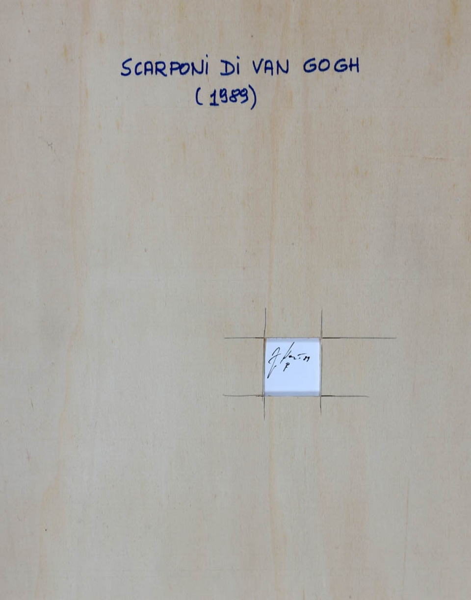 JIRI KOLAR 1914 - 2002 " Scarponi di Van Gogh ", 1989 Tecnica mista su carta, cm. 21,5 x 23,5 Firmato e datato sul retro Autentica dell'artista con impronta digitale su fotografia Autentica di Armando Nizzi su fotografia Timbro Galleria Sincron Brescia, su fotografia ESPOSIZIONI: " Jiri Kolar, Omaggio a Van Gogh ", Galleria Sincron Brescia, 1990 Prov. Collezione Privata