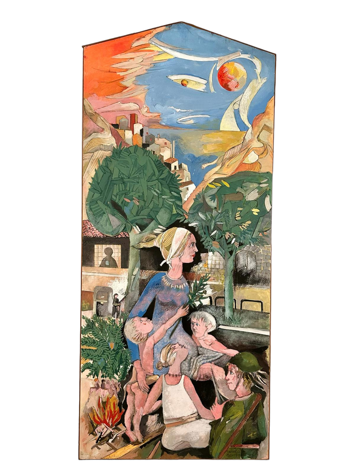 FRANCO MONTEMAGGIORE Olio su compensato raffigurante personaggi h cm 303 x 132
