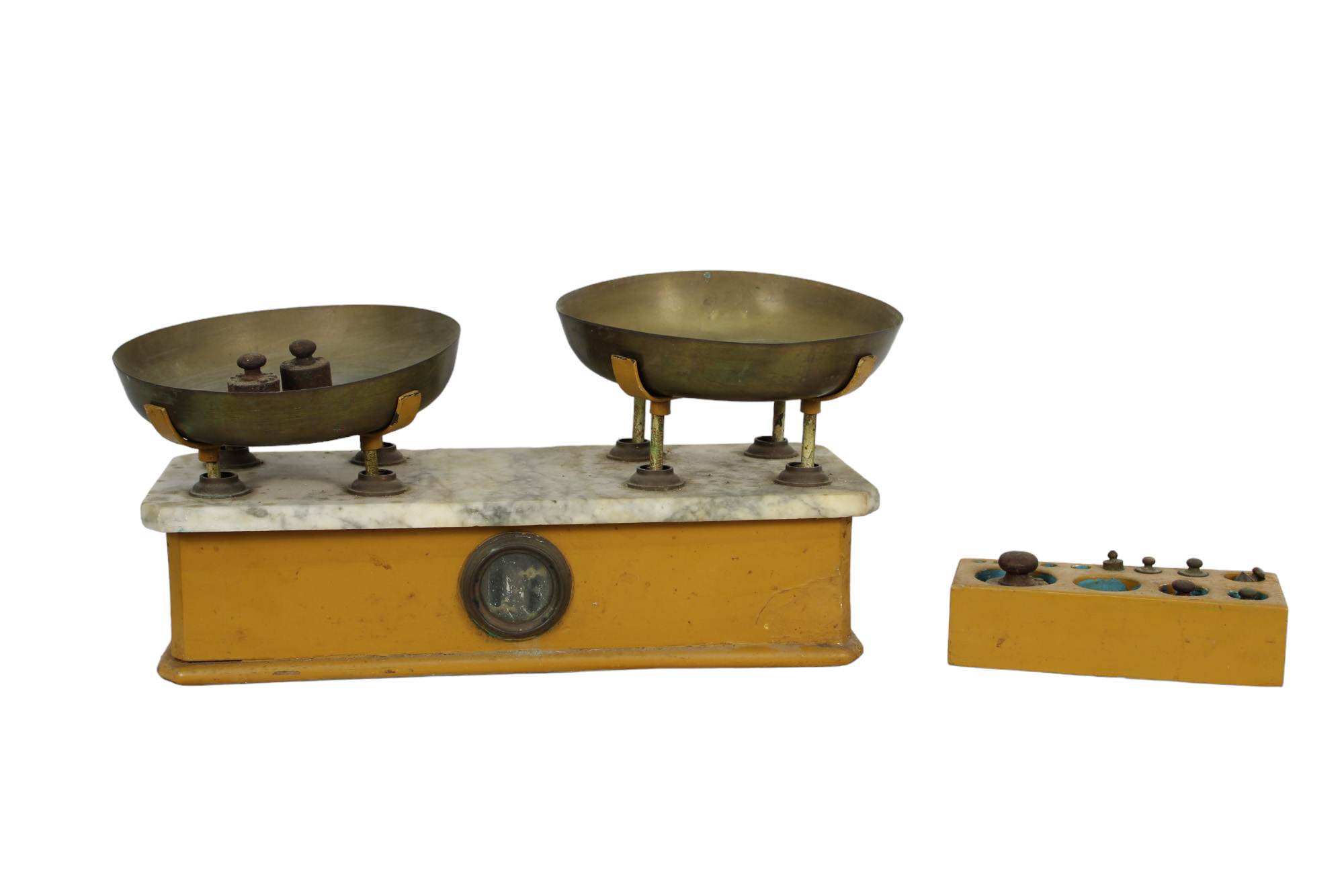 BILANCIA a doppio cestello in legno ferro e marmo bianco di Carrara Sicilia fine XIX secolo h cm 22 x 44 x 19