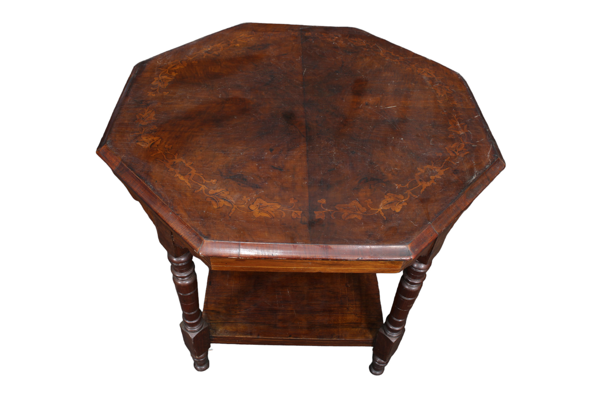 TAVOLINO OTTAGONALE in radica di noce e tarsie in varie essenze di legno Inghilterra XIX secolo h cm 67 x ø 74