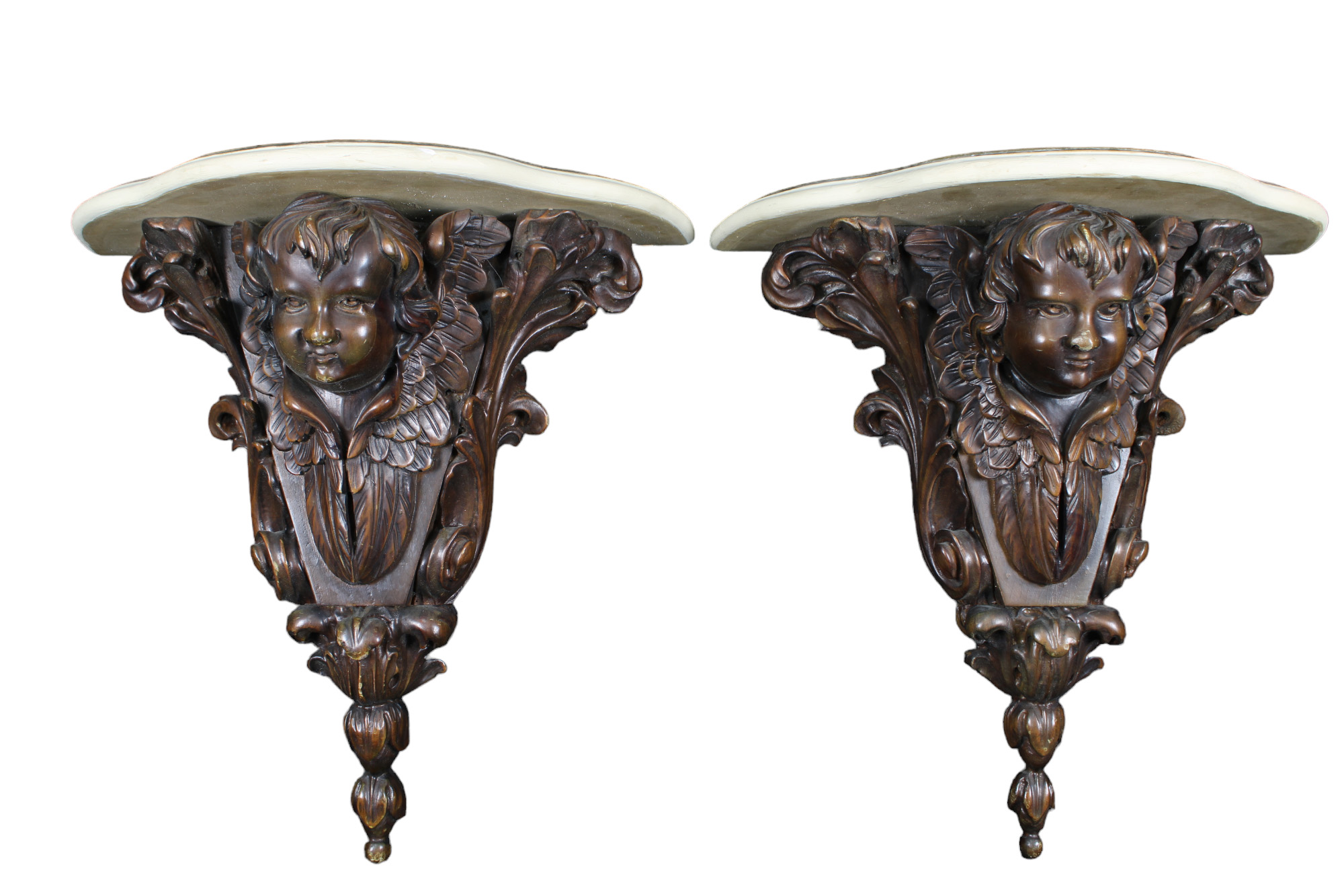 COPPIA DI MENSOLE in legno finemente scolpito raffigurante angeli, piani in legno laccato e dipinto maestranze siciliane primi 900 h cm 51,5 x 50 x 23