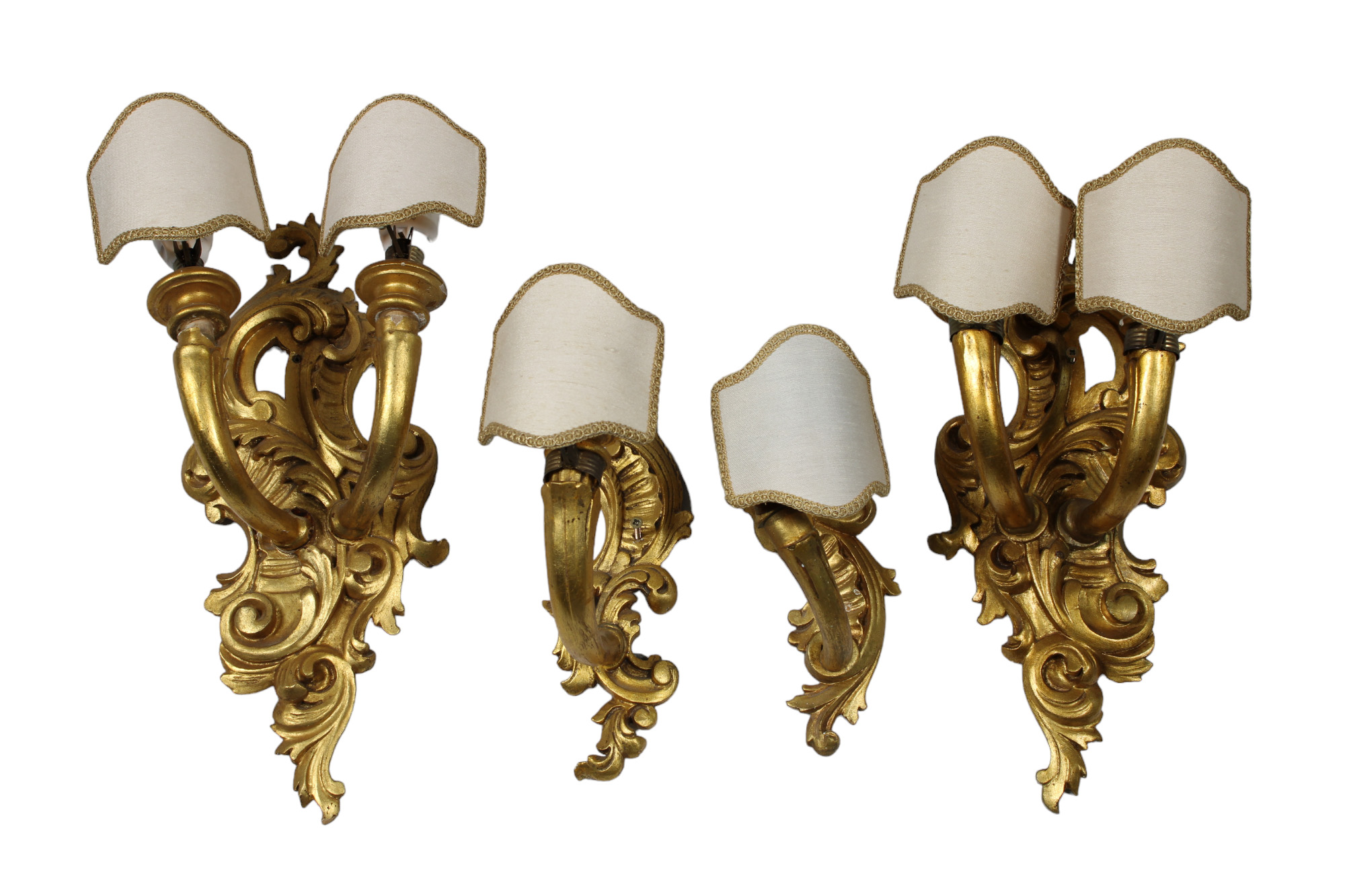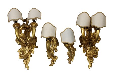 LOTTO DI 4 APPLIQUES in legno scolpito e dorato Sicilia primi 900 h cm 42 x 16 x 20 / h cm 27 x 10 x 20
