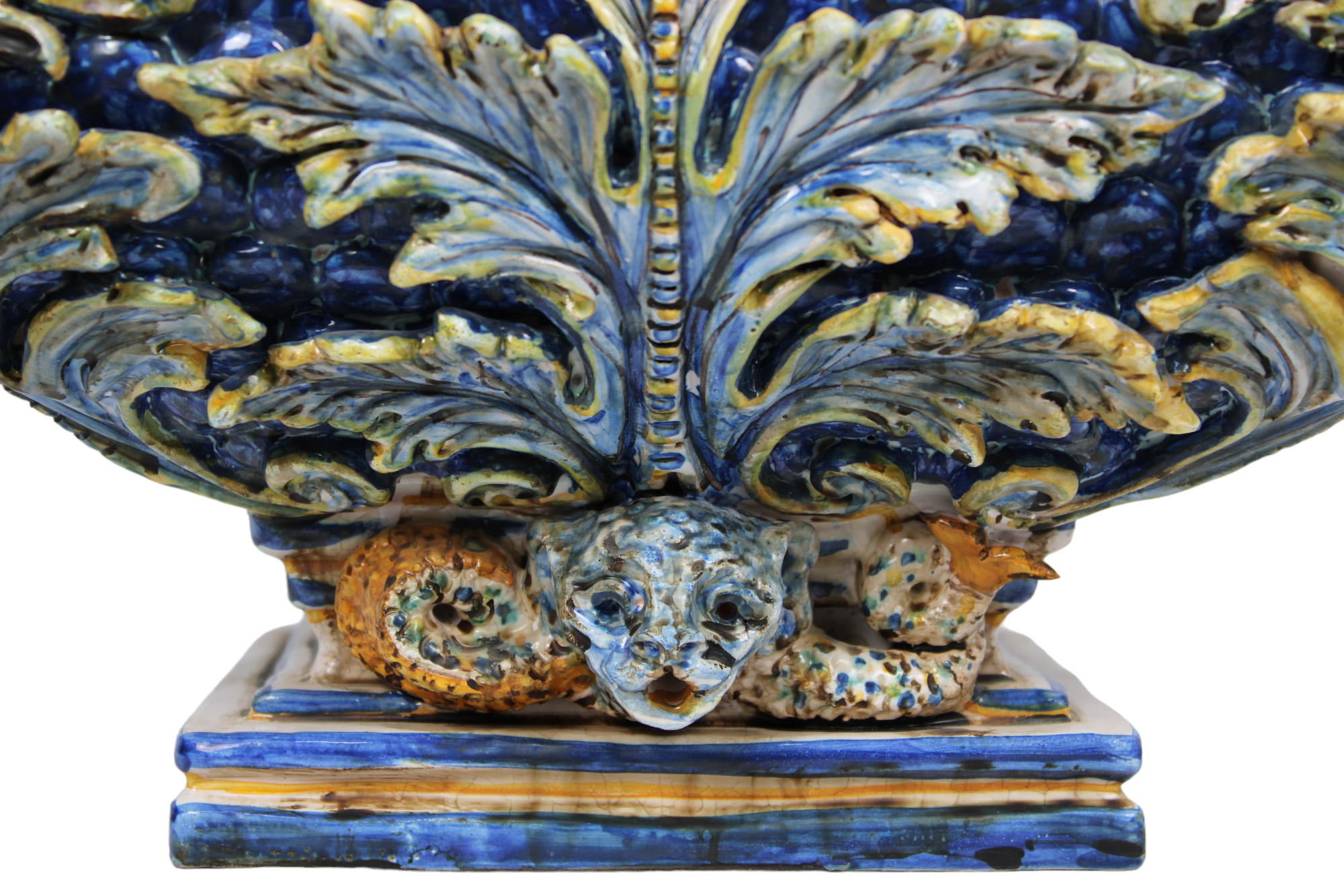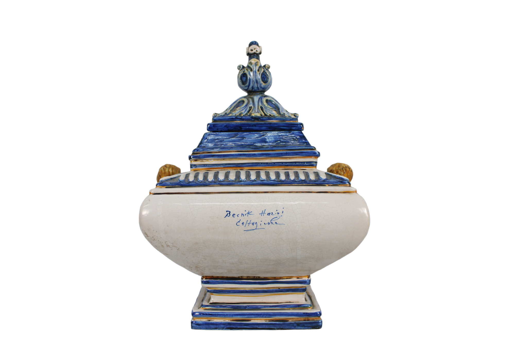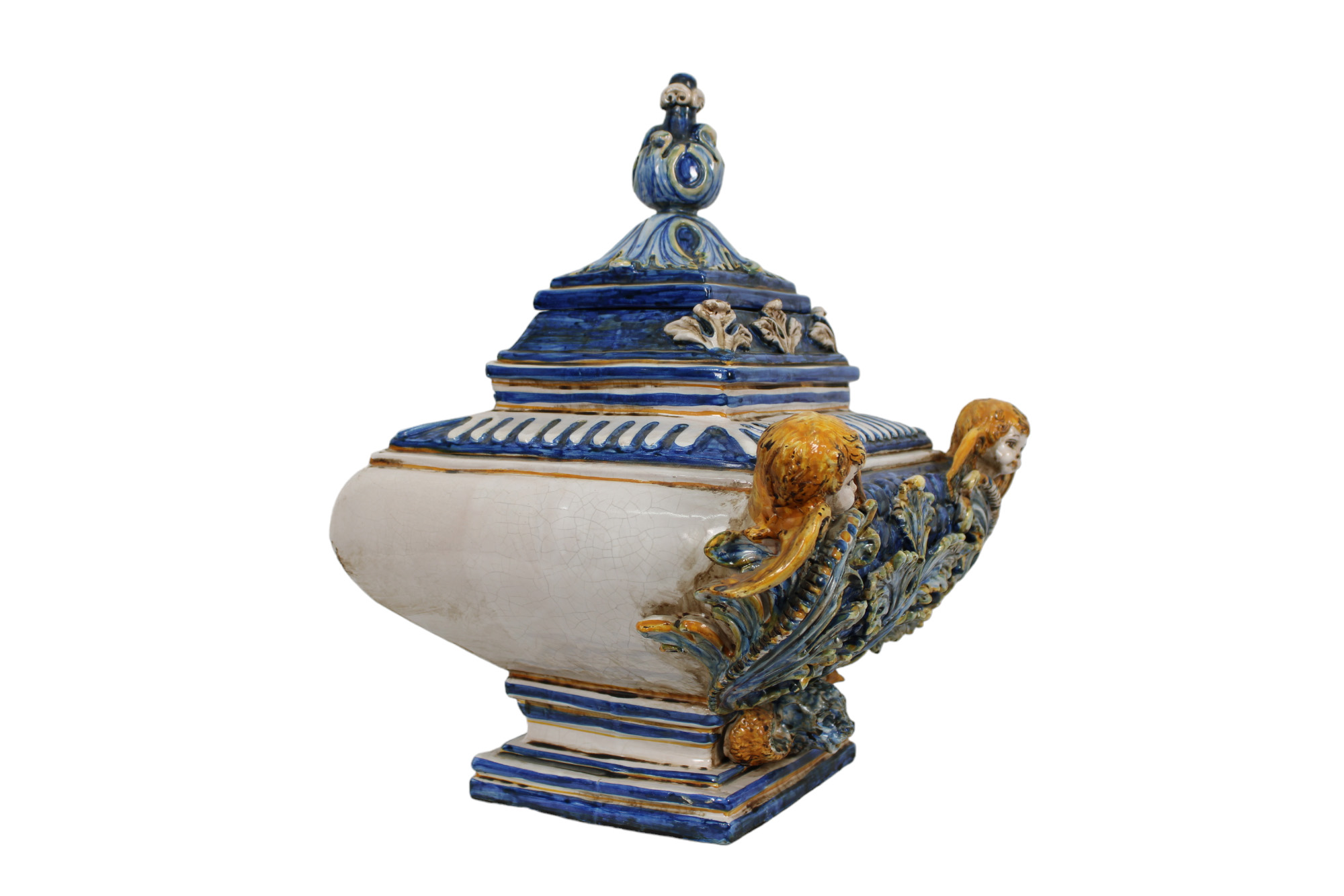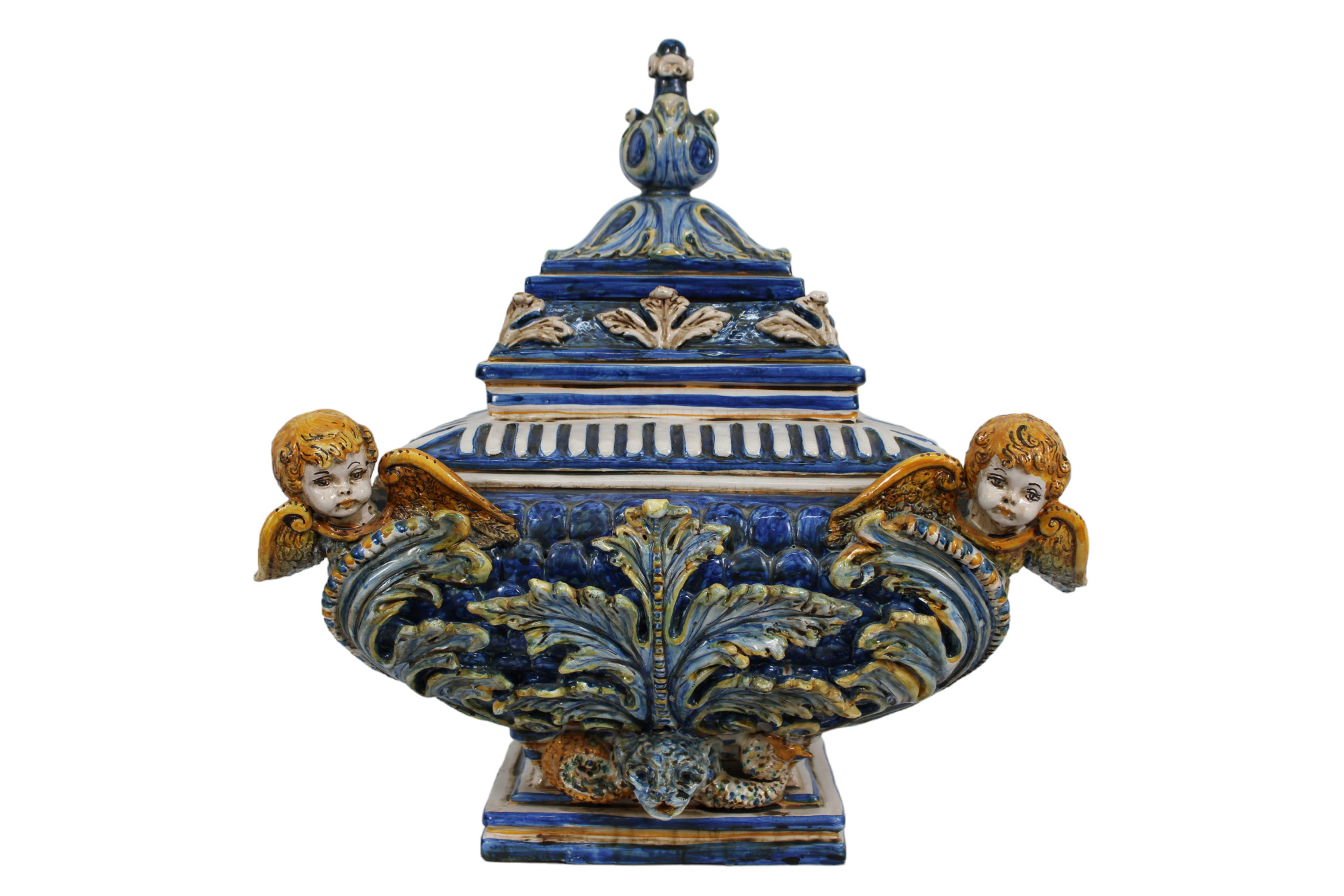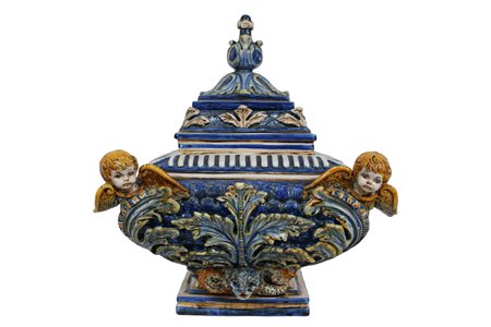GRANDE VASO CON COPERCHIO in maiolica policroma raffigurante angeli maestranze siciliane XX secolo h cm 49 x 41 x 35