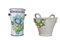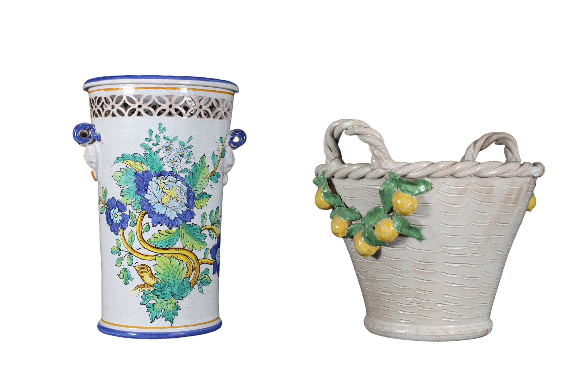 LOTTO COMPOSTO DA un porta ombrelli e un vaso a forma di cesto in maiolica policroma maestranze siciliane XX secolo h cm 49 x ø 30 / h cm 41 x ø 45