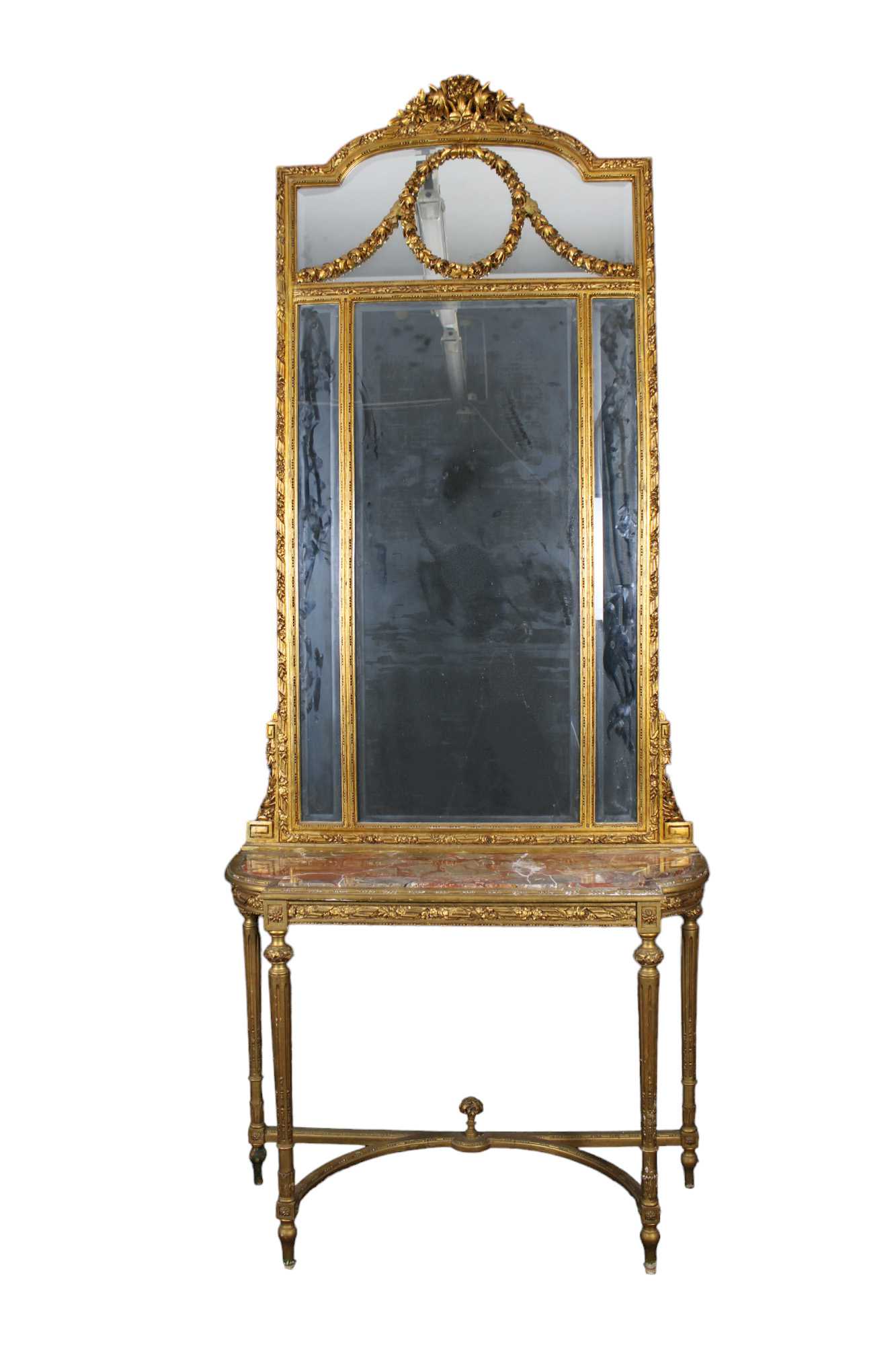 CONSOLLE CON SPECCHIERA in legno scolpito e dorato piano in diaspro siciliano Sicilia XIX/XX secolo h cm 299 x 125 x 45