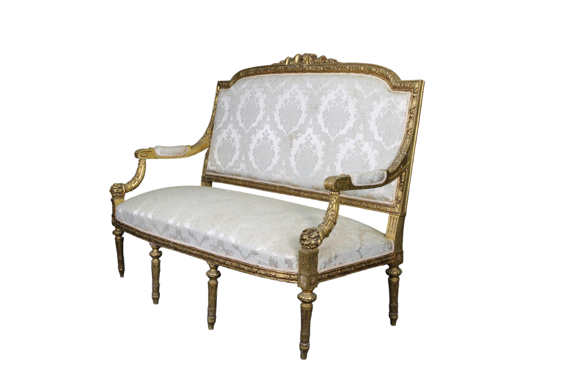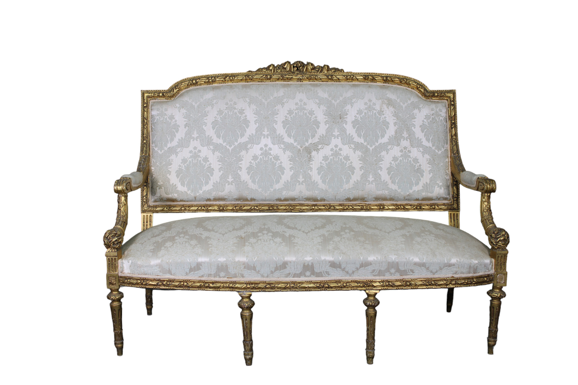 DIVANO in legno riccamente scolpito e dorato di gusto Luigi XVI Francia fine XIX secolo h cm 125 x 160 x 75