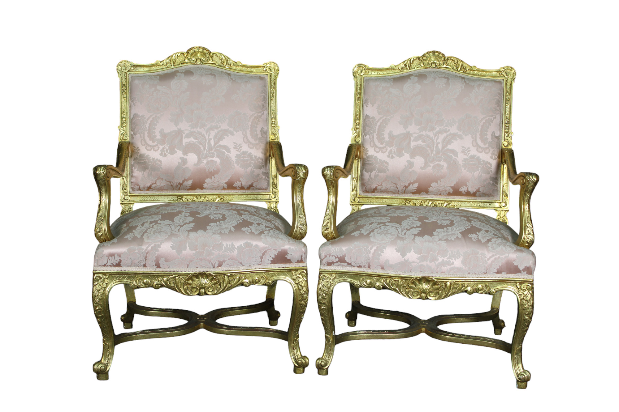 COPPIA DI POLTRONE in legno riccamente intarsiato e dorato manifattura francese XIX/XX secolo h cm 101 x 67 x 56