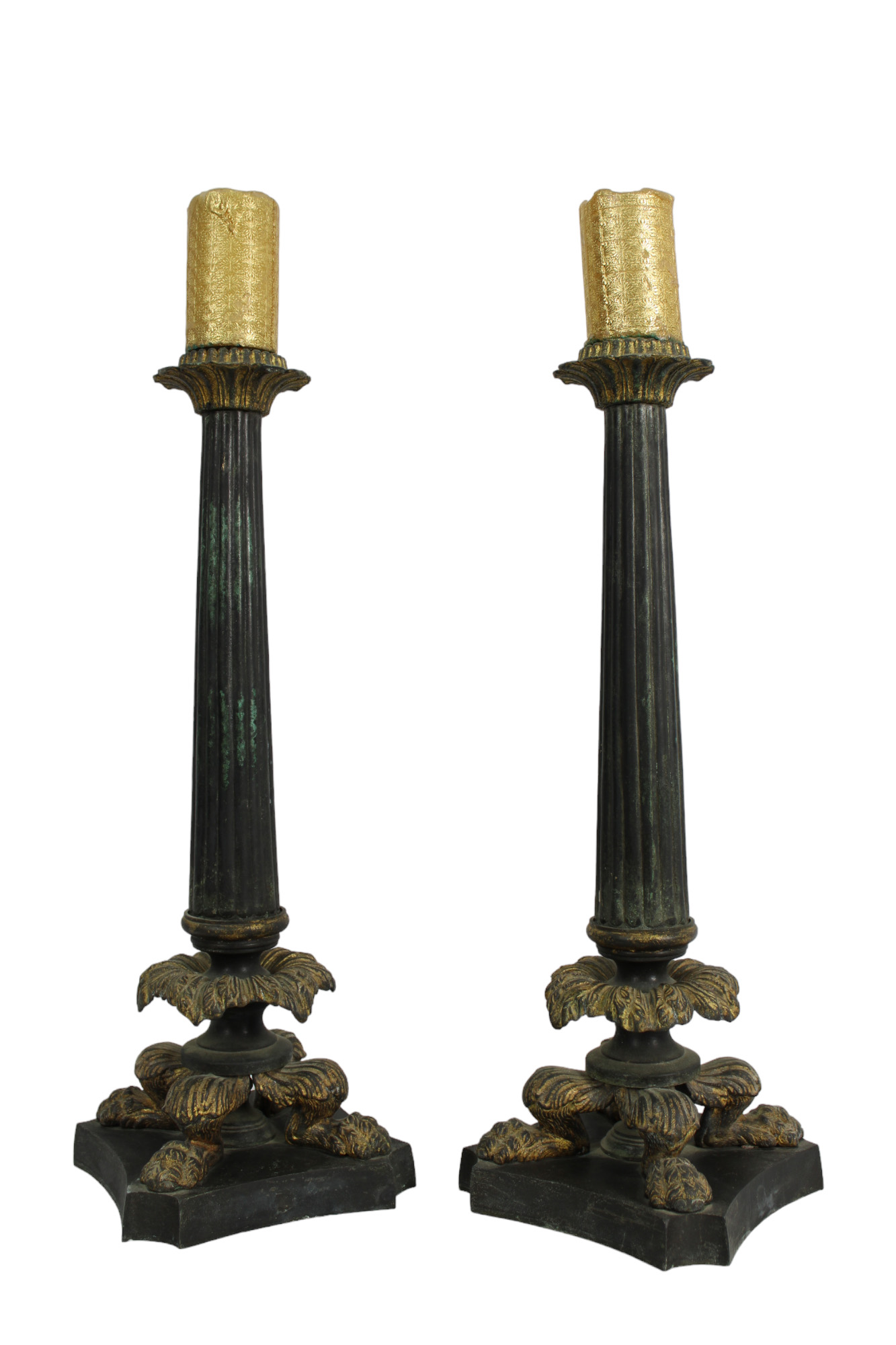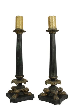 COPPIA DI TORCERI in bronzo patinato e doratura a freddo Francia XIX/XX secolo h cm 58 x 16,5