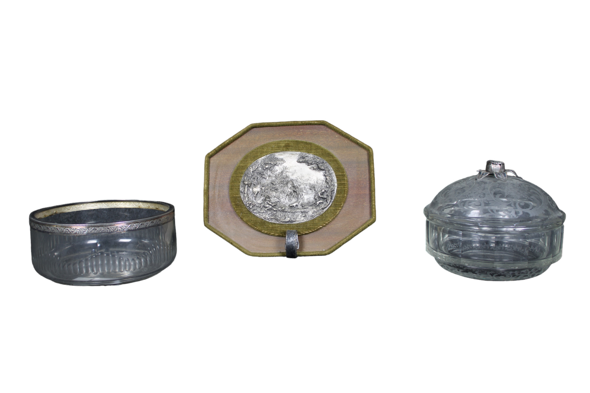 LOTTO COMPOSTO DA 2 centrotavola in cristallo e applicazioni in argento e una placca in bassorilievo in metallo argentato varie manifatture XX secolo misure varie