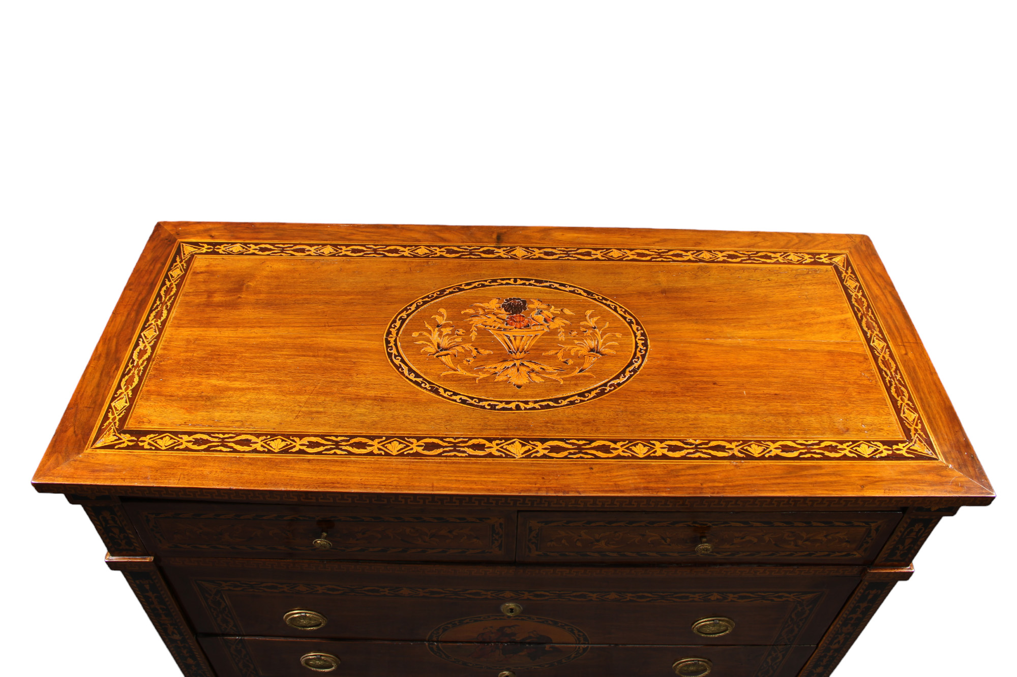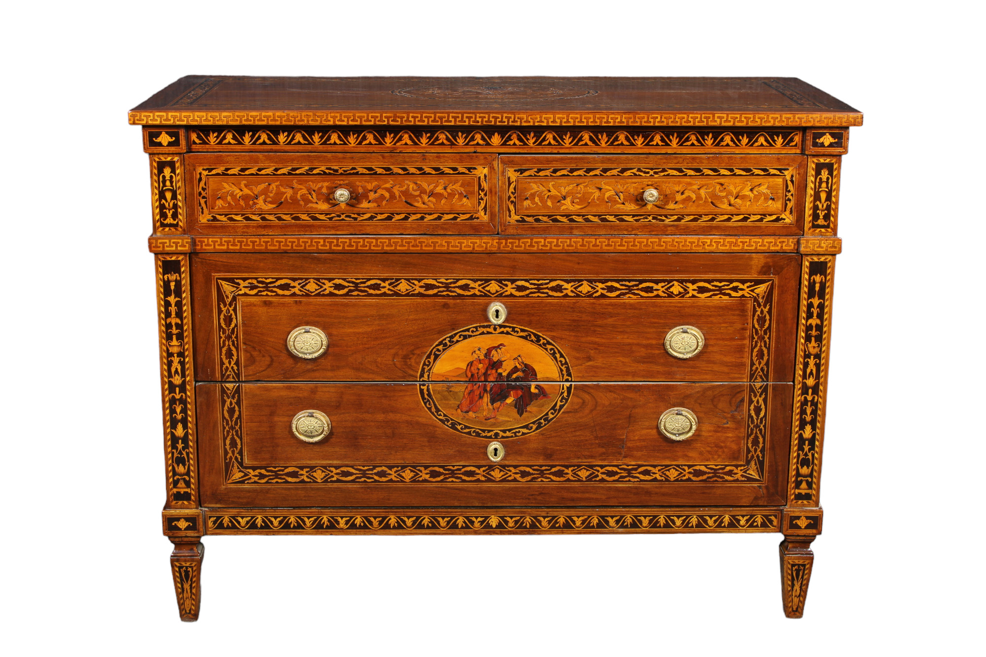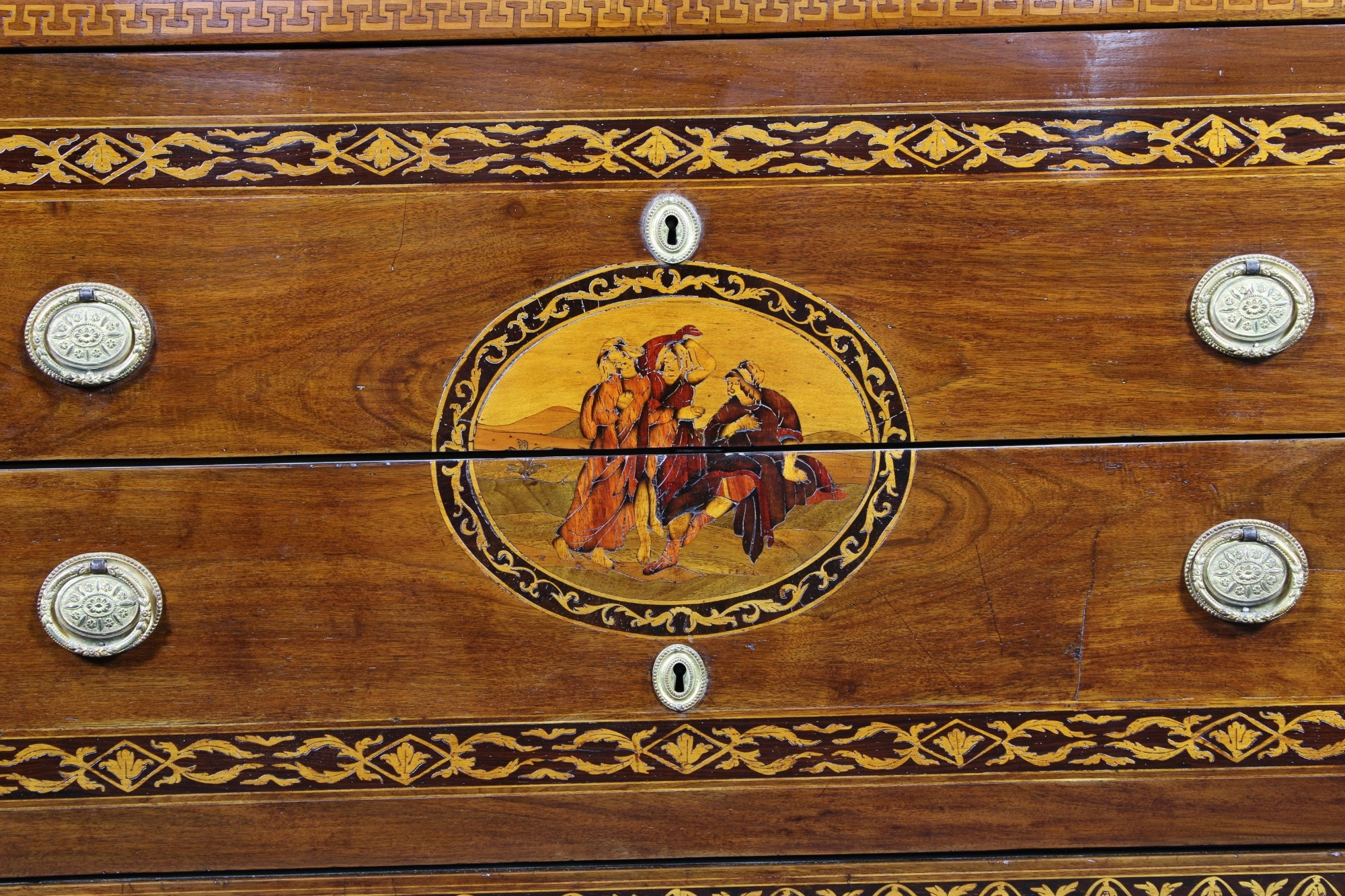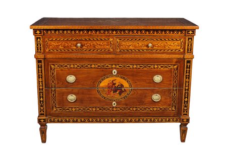 IMPORTANTE CASSETTONE in legno di noce riccamente intarsiato in varie essenze di legno di gusto magiolino Lombardia 1780-1820 circa h cm 96 x 124,5 x 55