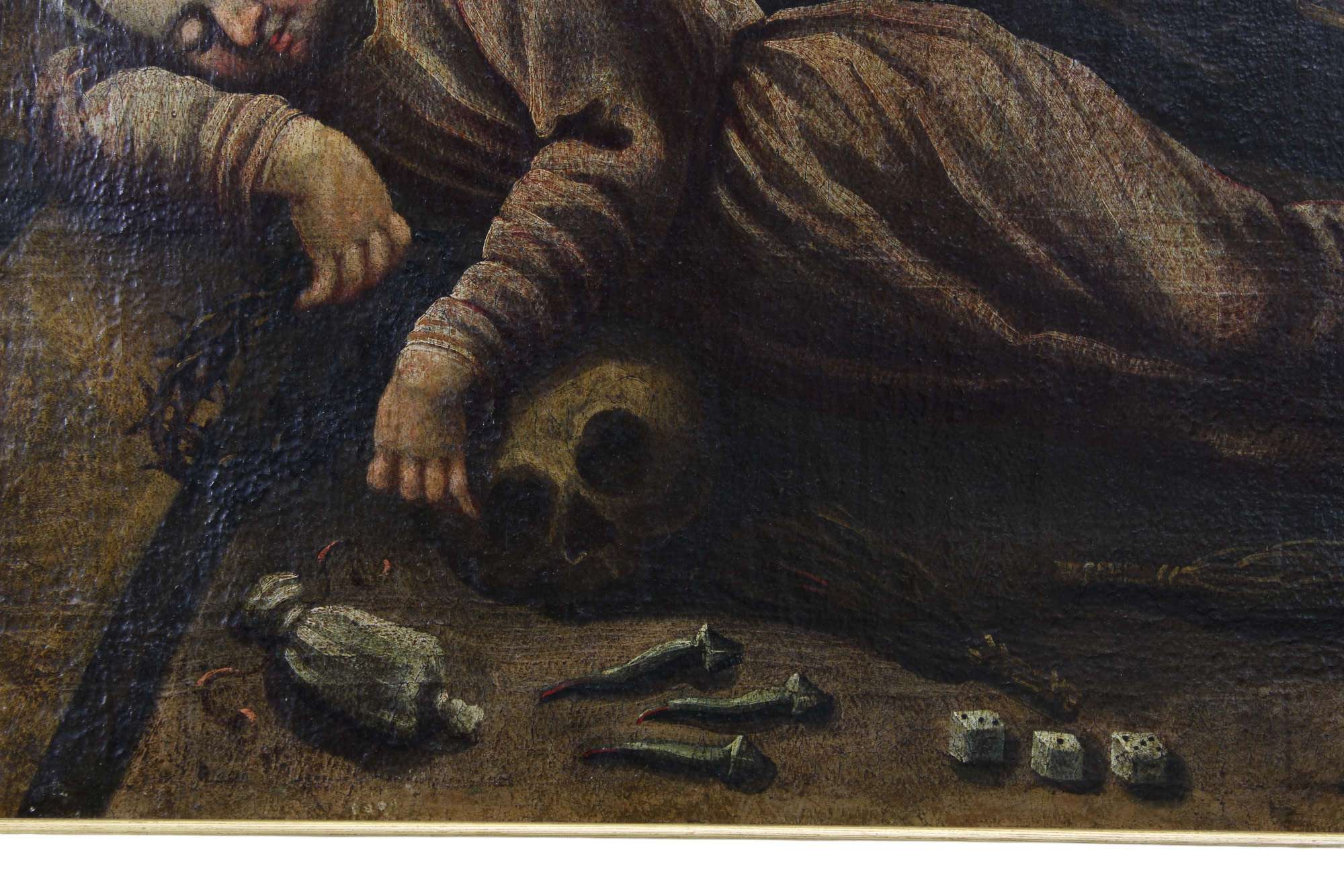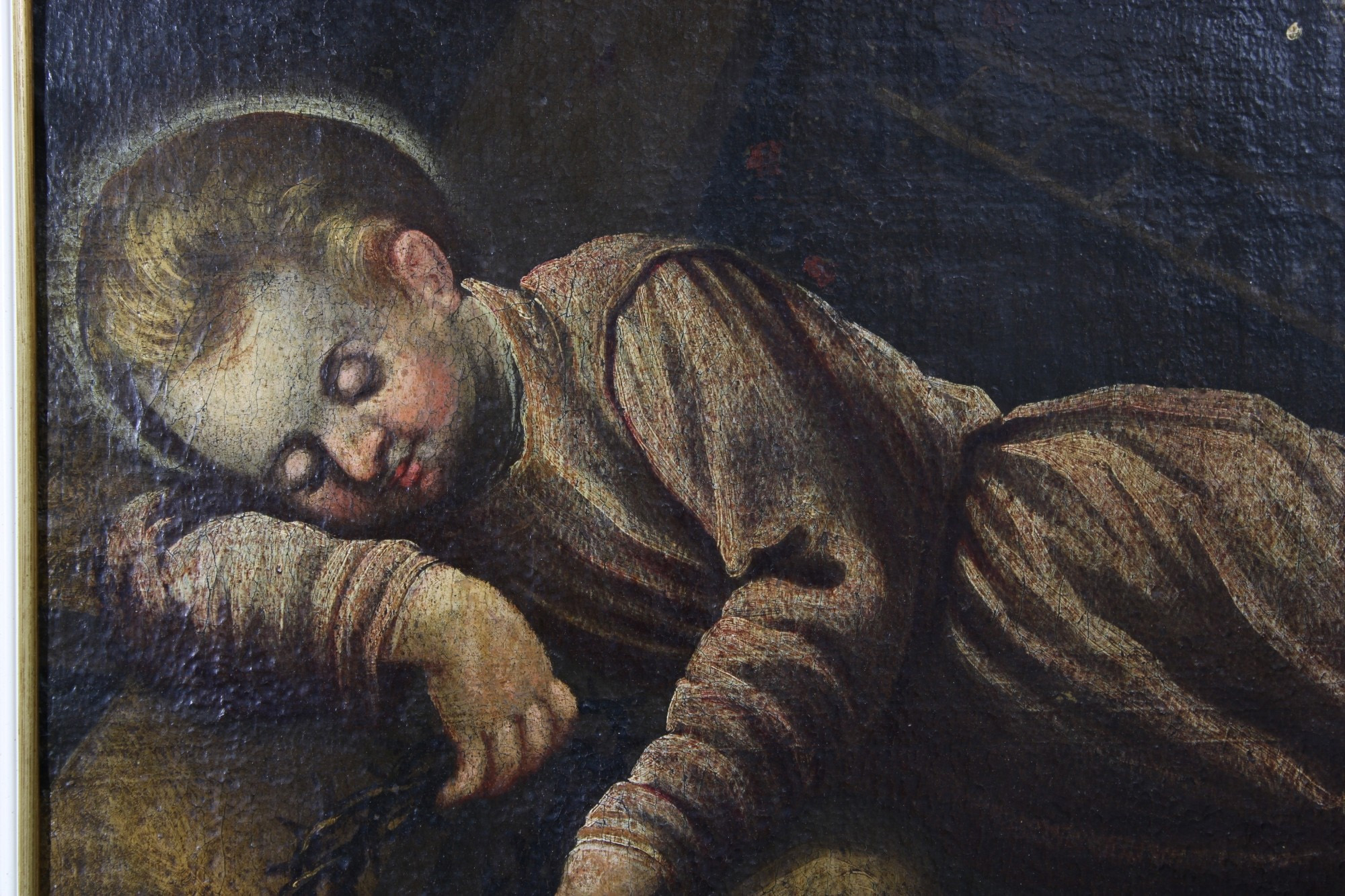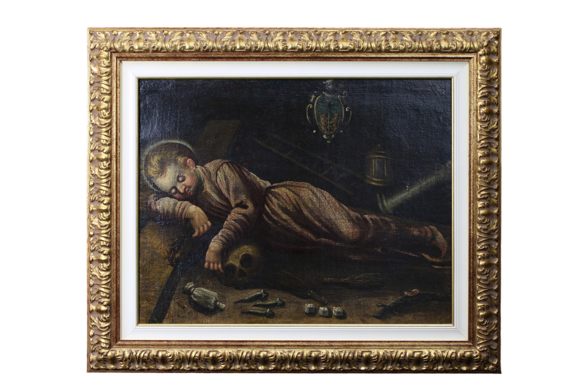 OLIO SU TELA raffigurante Gesu Bambino abbracciato alla croce con simboli della passione scuola italiana XVII/XVIII secolo