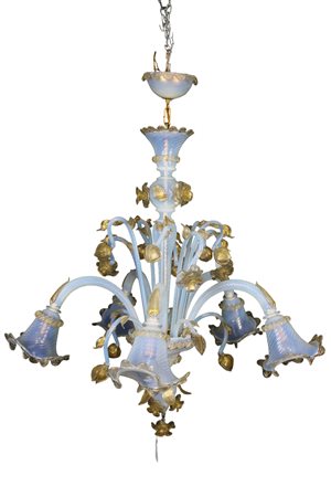 LAMPADARIO A 5 BRACCI in vetro di Murano con lumeggiature in oro, piccole rotture e mancanze Venezia primi 900 h cm 96 x 85