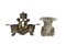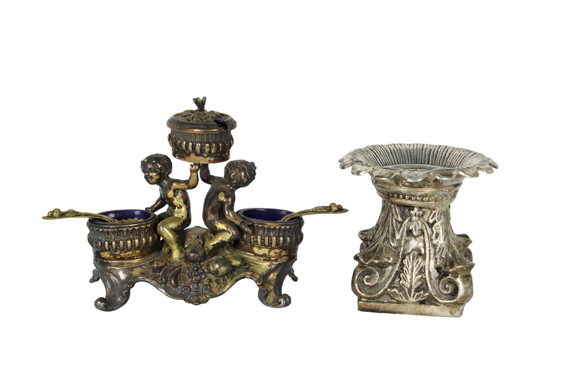 SALSIERA in bronzo dorato e finemente cesellata raffigurante putti, una salsiera a forma di capitello in metallo argentato Italia XIX/XX secolo h cm 10 x 12 / h cm 8 x ø 8,5